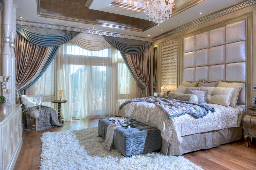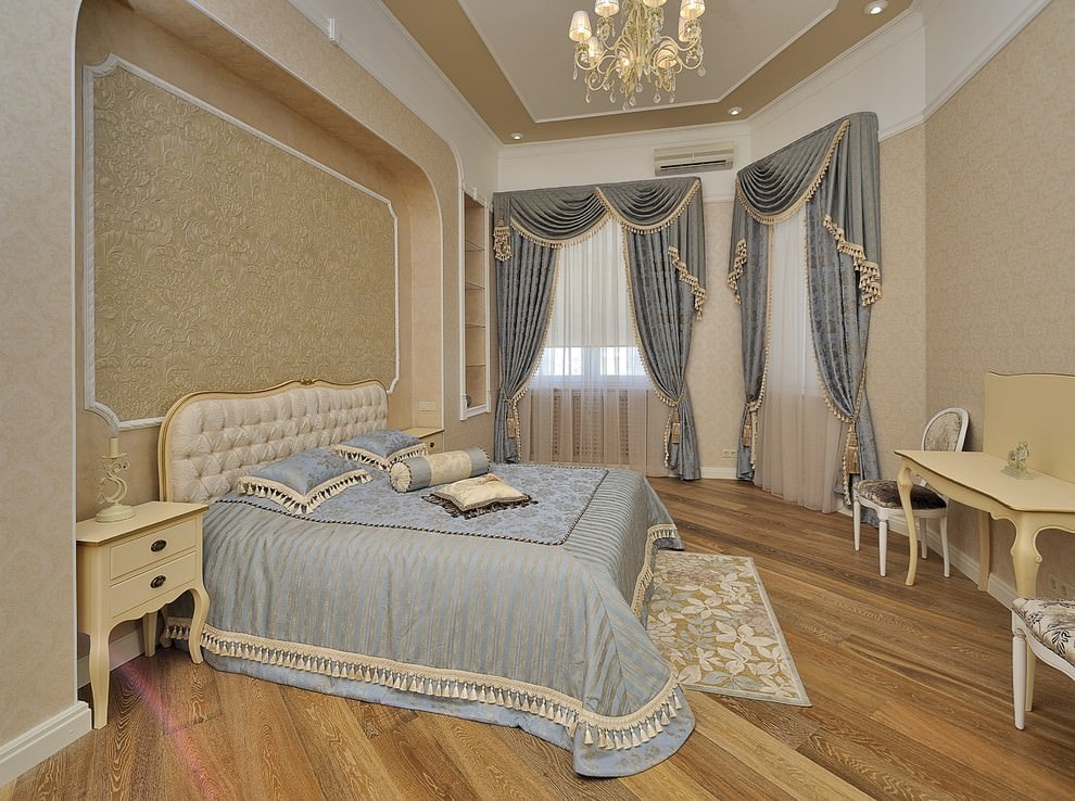 - متناظرة. يتم ربط الستائر على كلا الجانبين في نفس الارتفاع. يبدو دافئ جدا ومتناغم. إذا تم حل الستائر في نصف دائرة ، فسيكون الجو أكثر رومانسية.