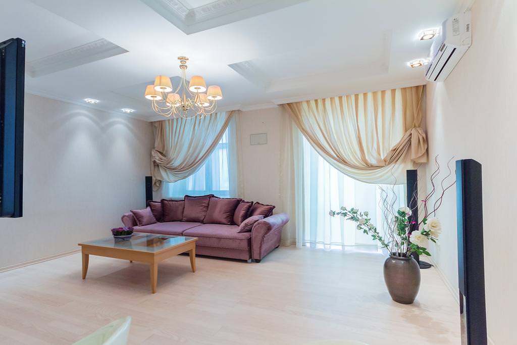 - إذا كانت الستائر طويلة جدًا ، فمن المستحسن استخدام عدة شاحنات صغيرة على مستويات مختلفة ، مما يؤدي إلى إنشاء طيات وتحولات بارزة. في هذا النموذج ، ستبدو الستائر على العلاقات مثيرة للاهتمام وأنيقة وليست جذابة.