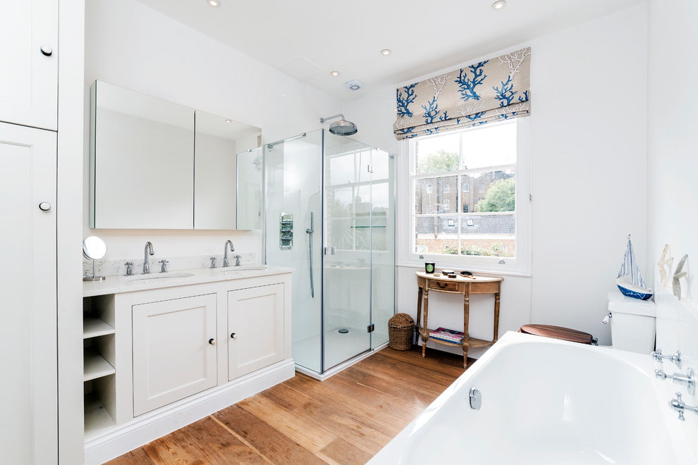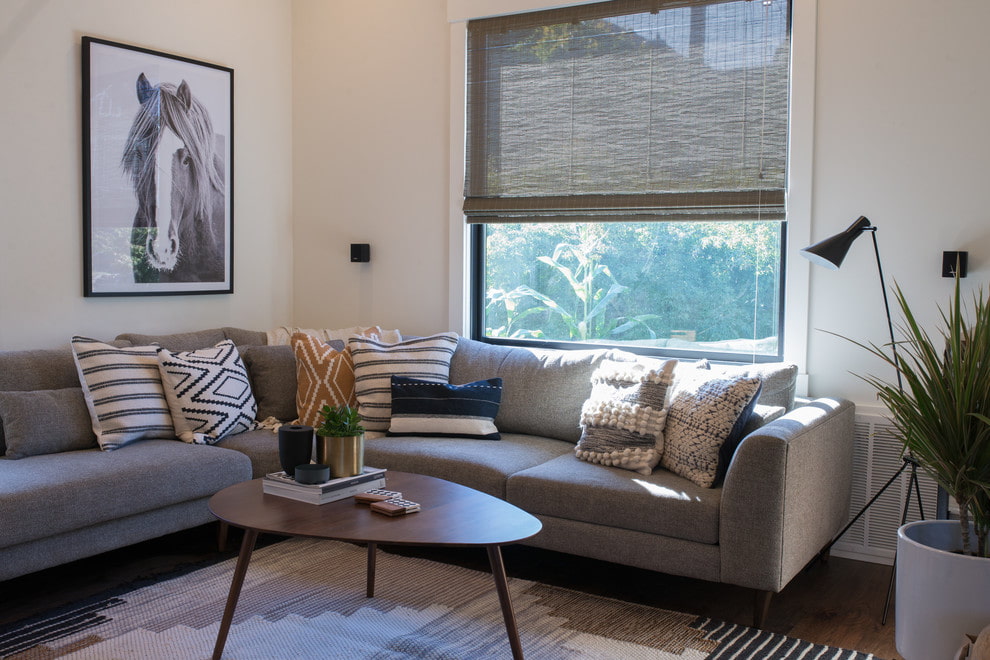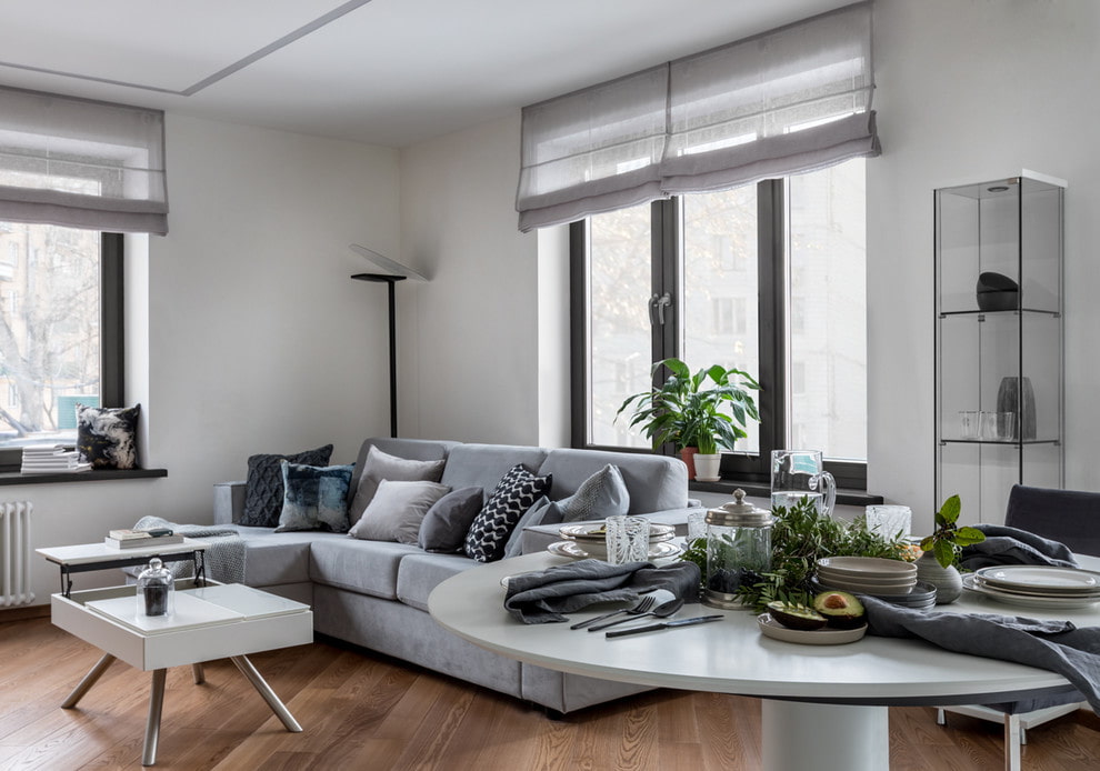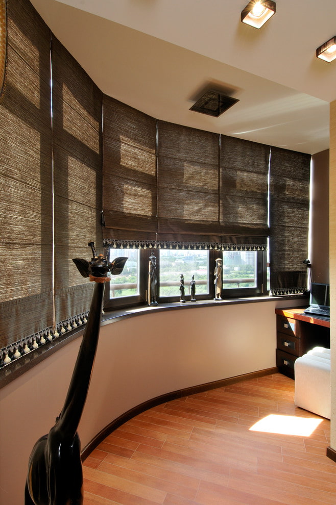 الستائر الرومانية ، التي تقع على النوافذ المندمجة ، تمتزج تمامًا مع الستائر أو الستائر