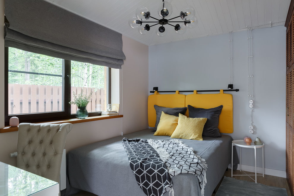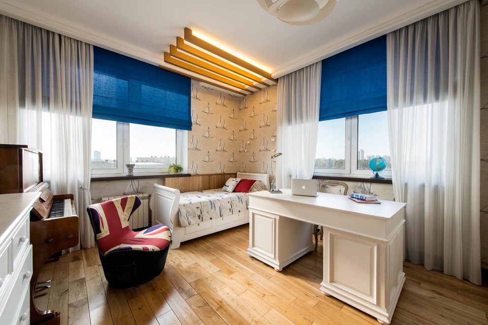 بالطريقة نفسها ، غالبًا ما يتم تعليق الستائر على السقف إذا ما ذهبت ، وفقًا لفكرة المصمم ، مع الستائر. تبدو مثيرة للاهتمام وحديثة.
