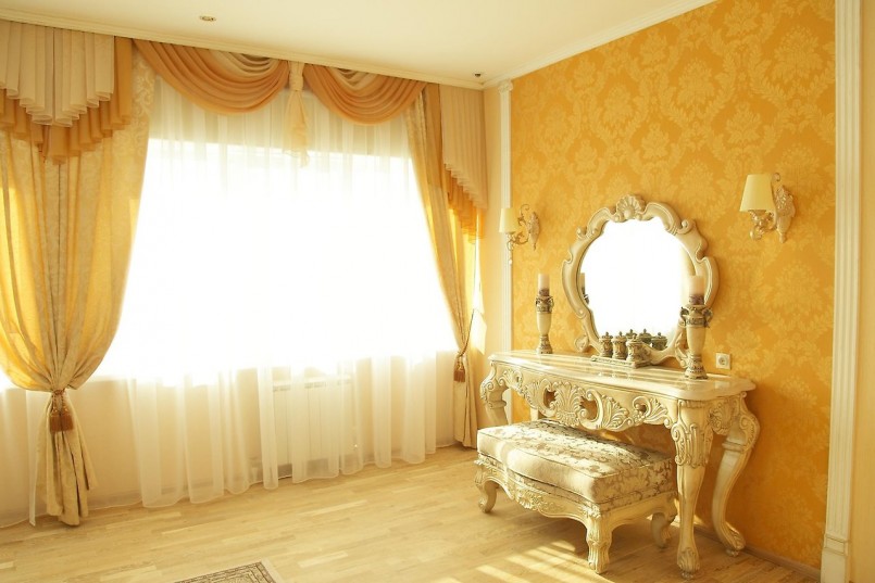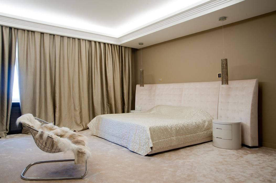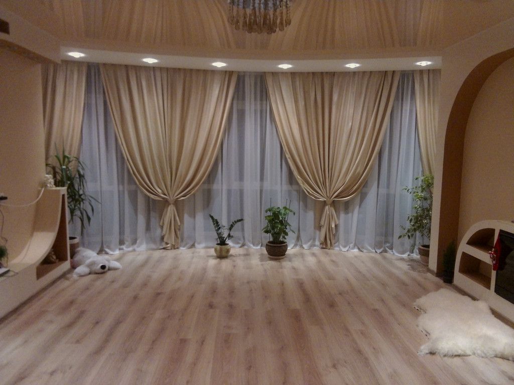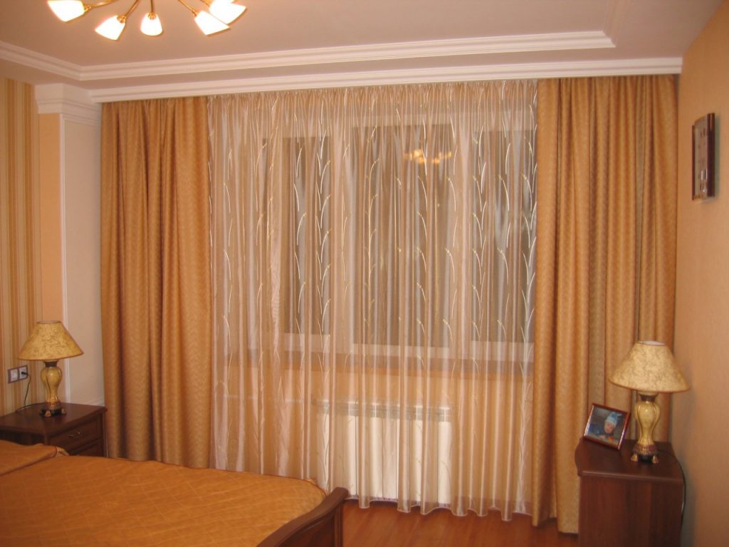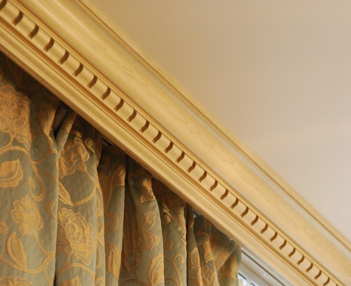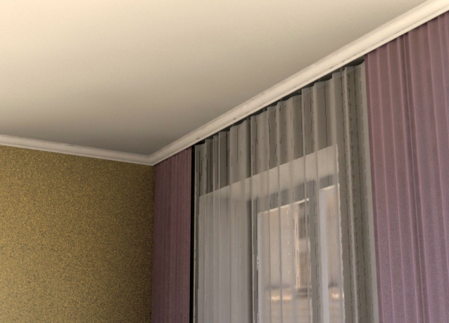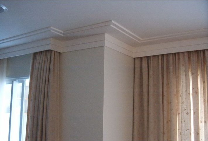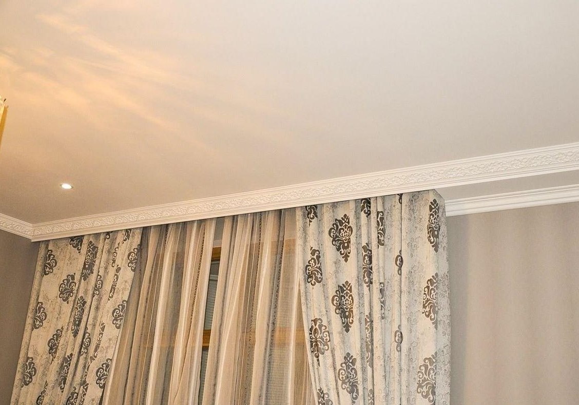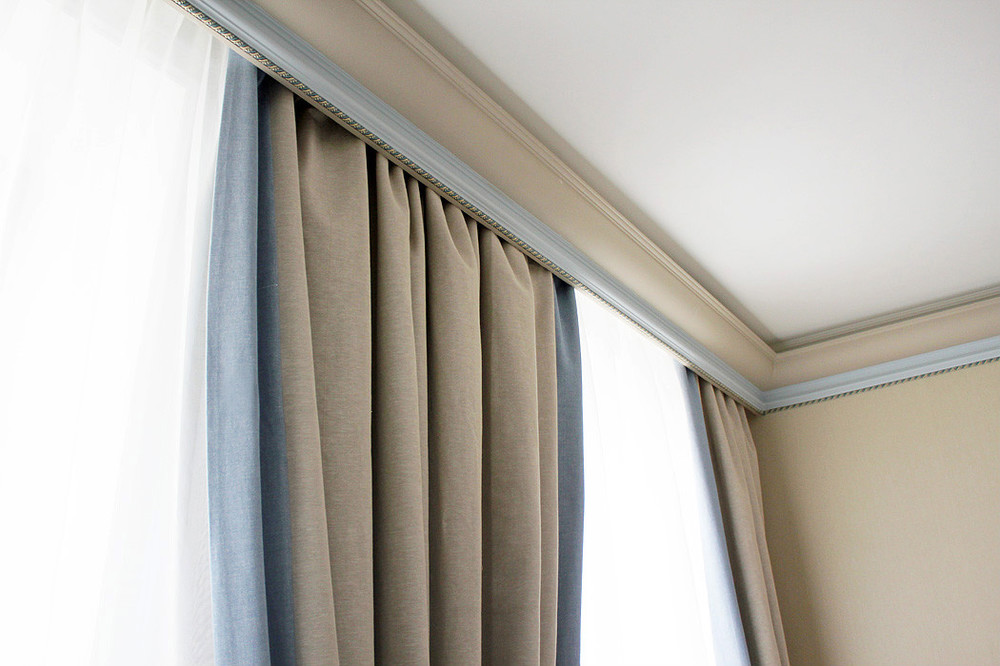 إذا تم تعليق الستائر على كورنيش السقف ، فمن السهل بما فيه الكفاية خلق وهم كورنيش مخفي بمساعدة طيدة عادية