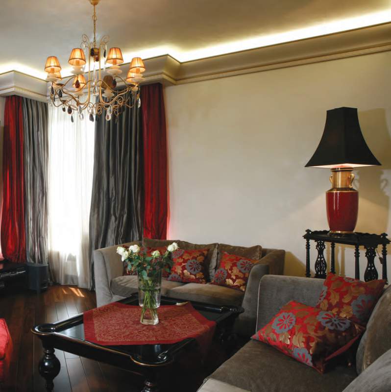 انتبه! تلعب طيدة السقف دورًا مهمًا في الديكور. يجب أن يكون تصميمه أو لونه أو زخرفة متناسقة مع النمط العام للغرفة.