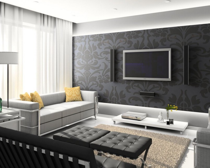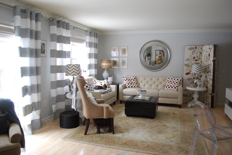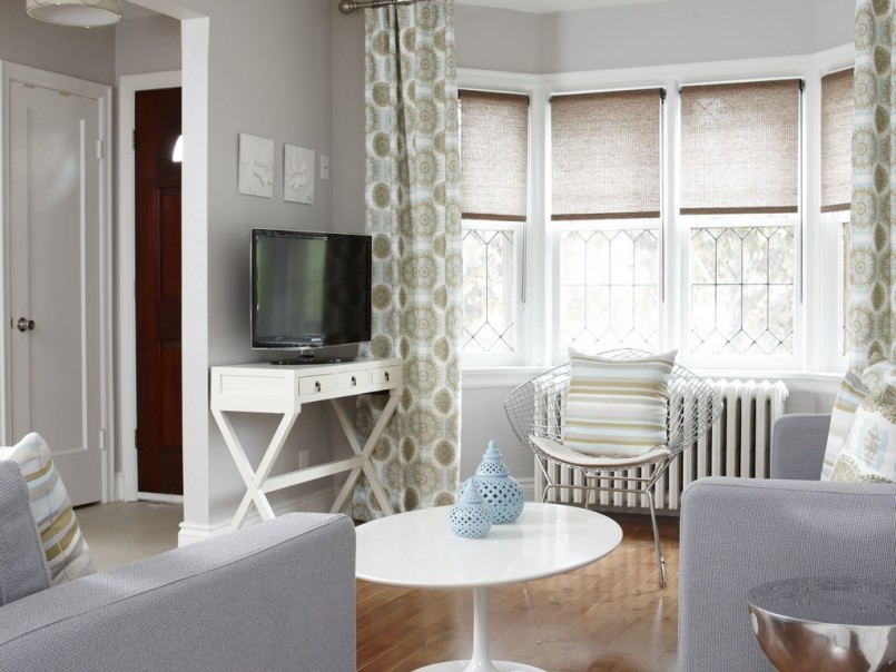 اختيار الستائر لورق الحائط الرمادي والأثاث الأبيض