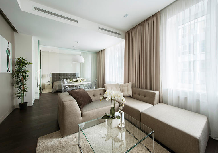 بالنسبة لغرف المعيشة والمطابخ ، يُسمح باستخدام الستائر الخالية من الوزن ، مما يؤدي إلى توسيع المساحة بصريًا.