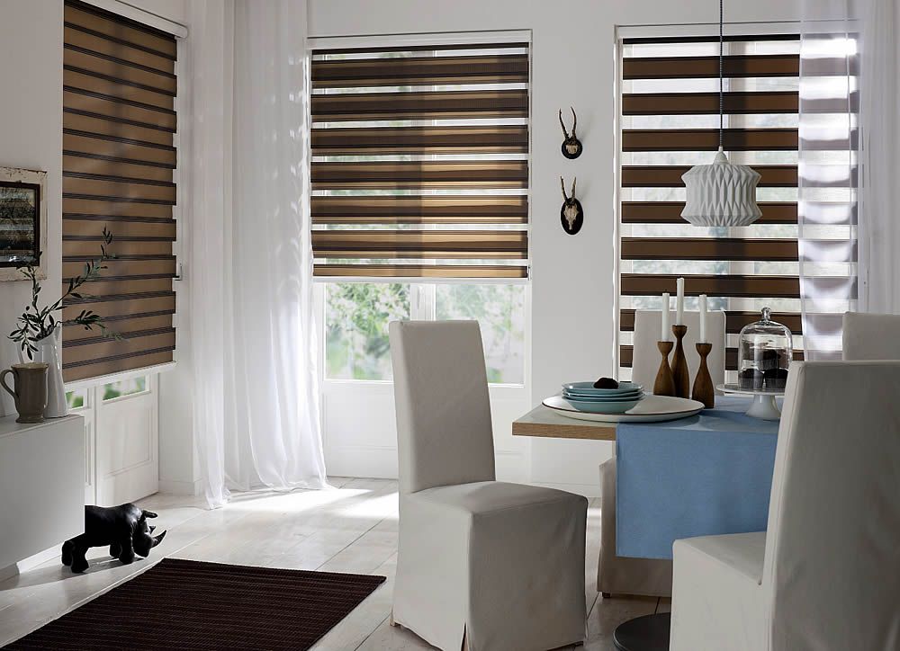 واحدة من النماذج الأكثر شعبية من الستائر الدوارة هو "ليلا ونهارا". بعض الشركات المصنعة يطلق عليها "حمار وحشي". هذه الأسماء الستائر المكتسبة بسبب التصميم الأصلي. إنه يعتمد على نسيج ذو خطوط أفقية. النسيج يلف أسفل ، الشرائح العليا. عند تنشيط آلية الرفع ، تبدأ الشرائط في التحرك ، لتجمع. كنتيجة لمثل هذه الحركات اتضح لخلق مستوى مختلف تمامًا من الإضاءة. خلال النهار ، يحتاج الملاك إلى ترك مناطق شفافة في مستوى واحد ، والمناطق المظلمة في الليل. إذا كنت ترغب في ذلك ، يمكنك ضبط الوضع "المتوسط". مع ذلك ، تخلق الغرفة شفقًا خفيفًا.