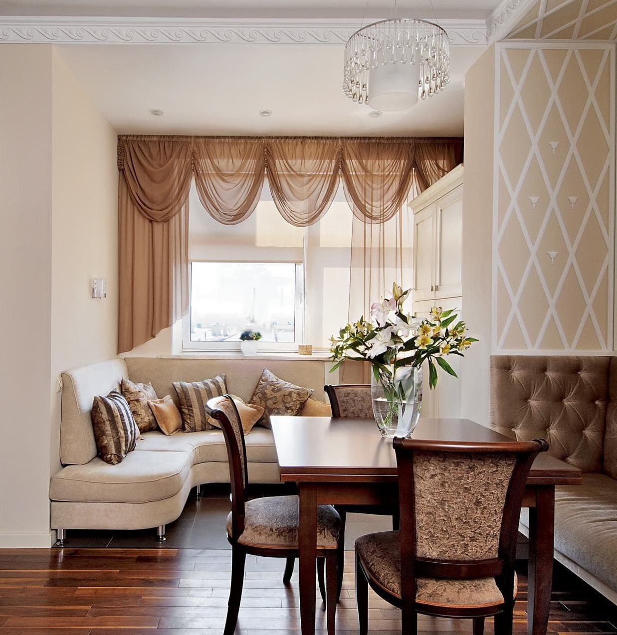 | Cحول الطيات (الكلاسيكية) | لا ينصح بتثبيت الإصدار الكلاسيكي مباشرة على وشاح ، في المنطقة المجاورة مباشرة للزجاج - تتطلب الطيات المسافة. في هذه الحالة ، من الأفضل اختيار تثبيت الستائر في الجزء العلوي من الفتحة أو على الجدران. |