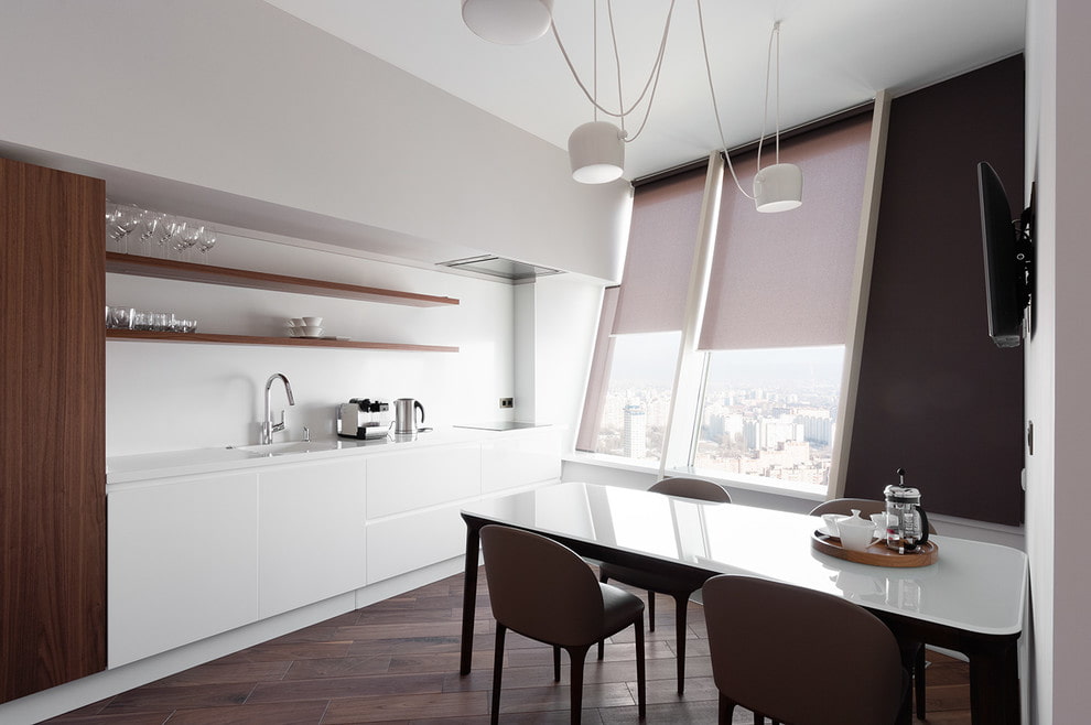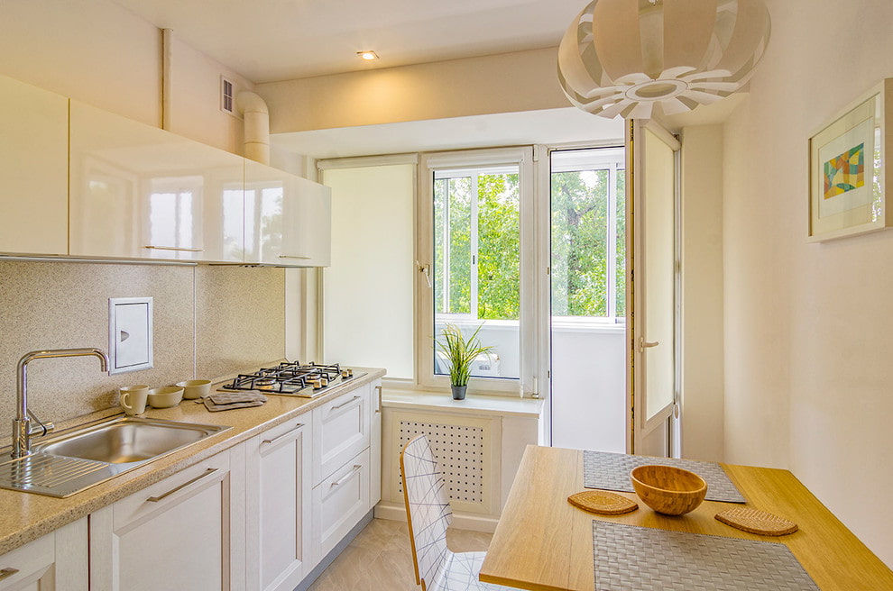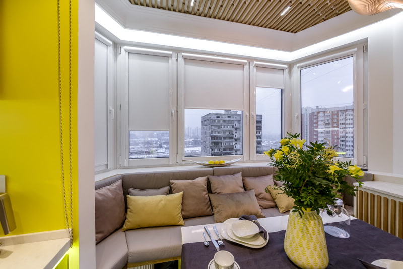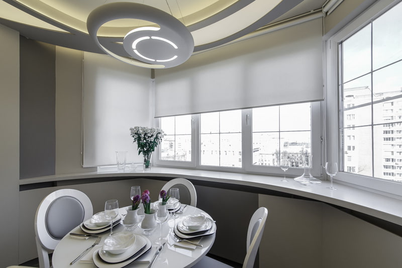 انزلاق النظم: أجزاء دهس بعضها البعض. من الأفضل اختيار قماش صلب على المنطقة بأكملها ، وإرفاقه بالسقف والجدار.إذا كان هناك باب شرفة في المطبخ ، فكر في قدرته على الحركة.