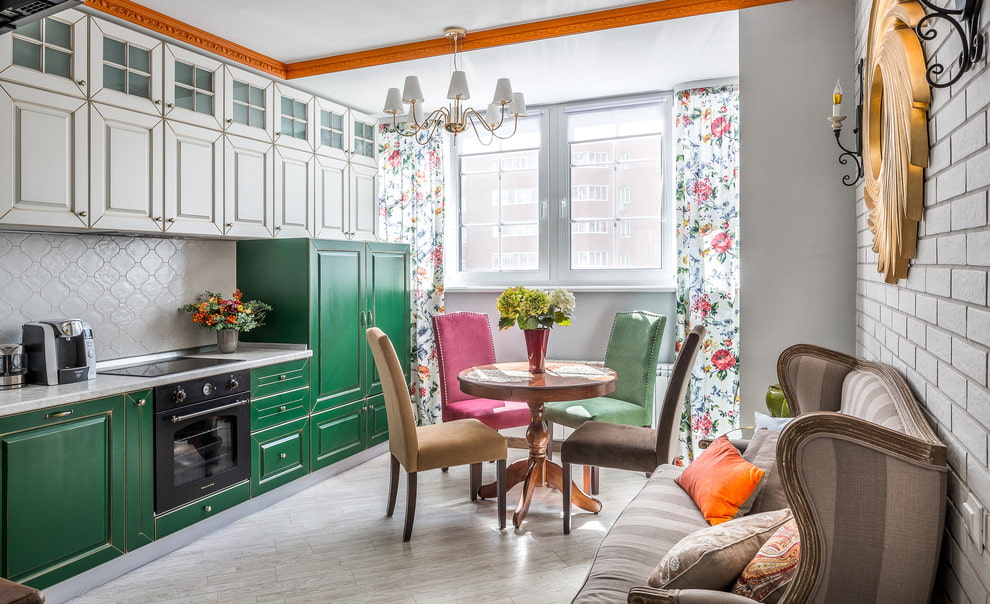 لعبة الألوان. يمكن أن يستمر في لوحة مشتركة ، كاستمرار للصورة. على سبيل المثال ، يتم اختيار الظل المناسب من الأخضر الزمردي للجدران الخضراء. غالبًا ما تستخدم الحركة التالية: مجموعة المطبخ والستارة مصنوعة بلون واحد. يبدو متناغم ، أنيق. أو تلعب الستارة دوراً متناقضاً ، حيث تظليل لون ورق الحائط أو سماعات الرأس. على سبيل المثال ، الجدران البيضاء - الستار الفيروز.