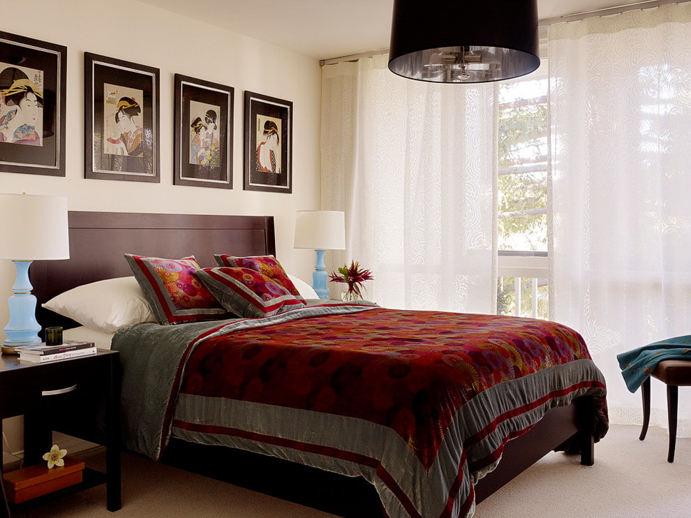 استخدام الستائر بورجوندي في المناطق الداخلية من غرفة المعيشة وغرفة النوم
