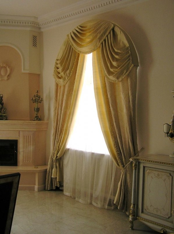 مجلس. عندما تكون غرفة المعيشة مزينة بأسلوب كلاسيكي كلاسيكي ، فإن ستائر التول الفاتحة مزينة بحدود ذهبية وتفاصيل مطرزة نادرة وعلاقات وشرابات.