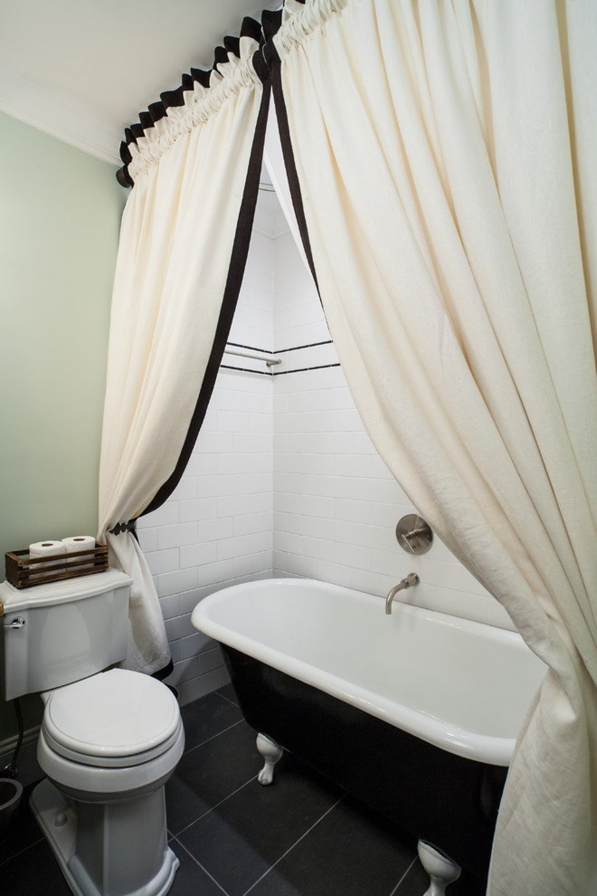 يتم تثبيت الستار الأبيض هنا على طنف بيضاوي ، لتكرار شكل الحمام