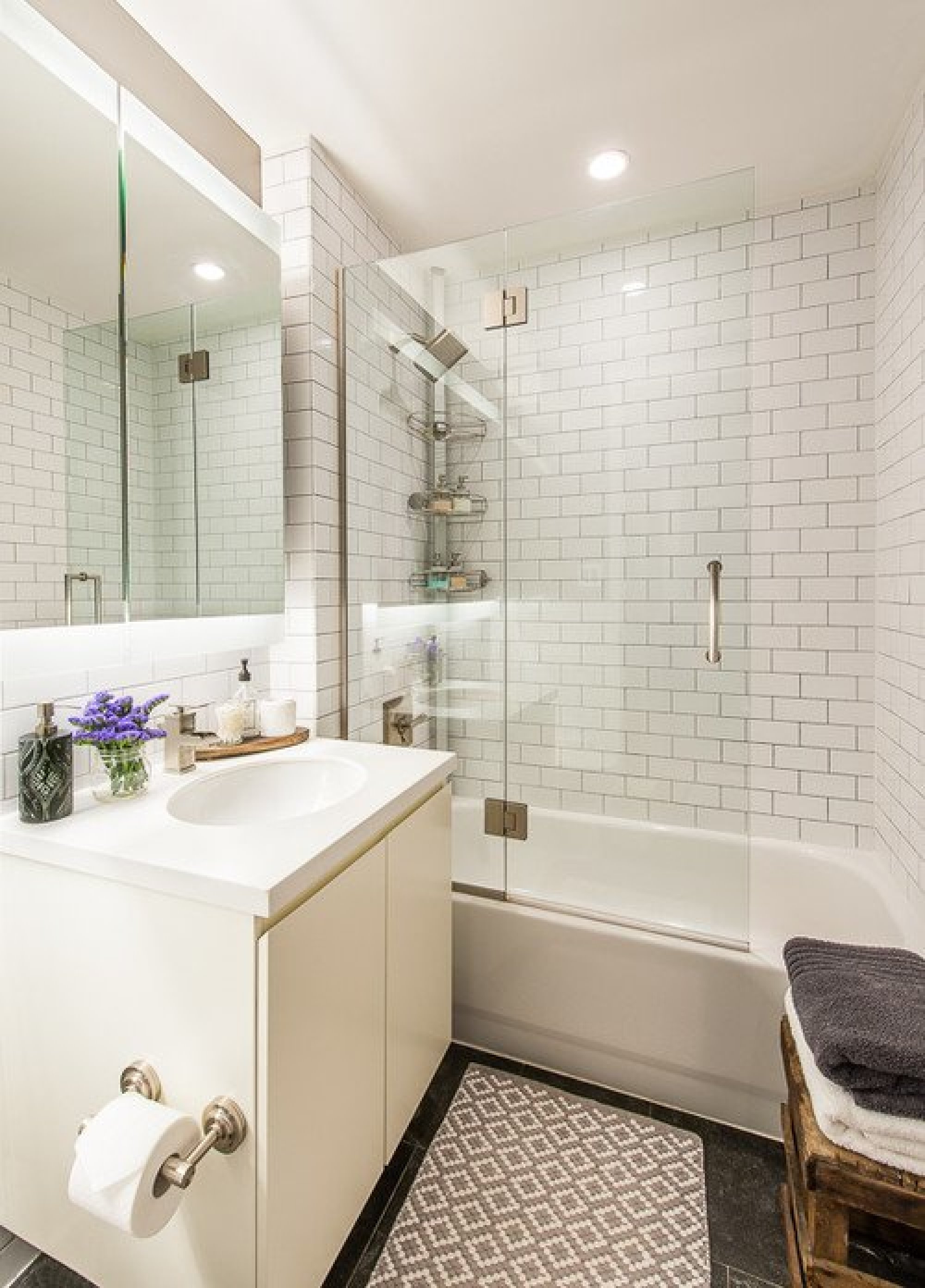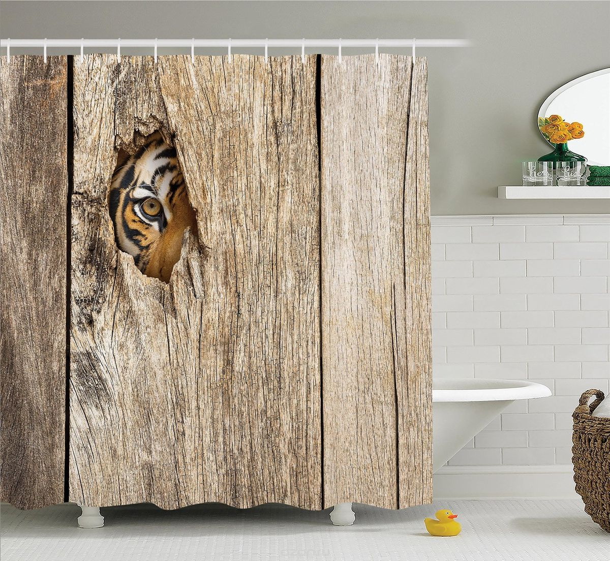 في هذه الصورة ، يشكّل الحمام والستارة تركيبة واحدة ، ويضيفان بعض البوتيك إلى الغرفة.