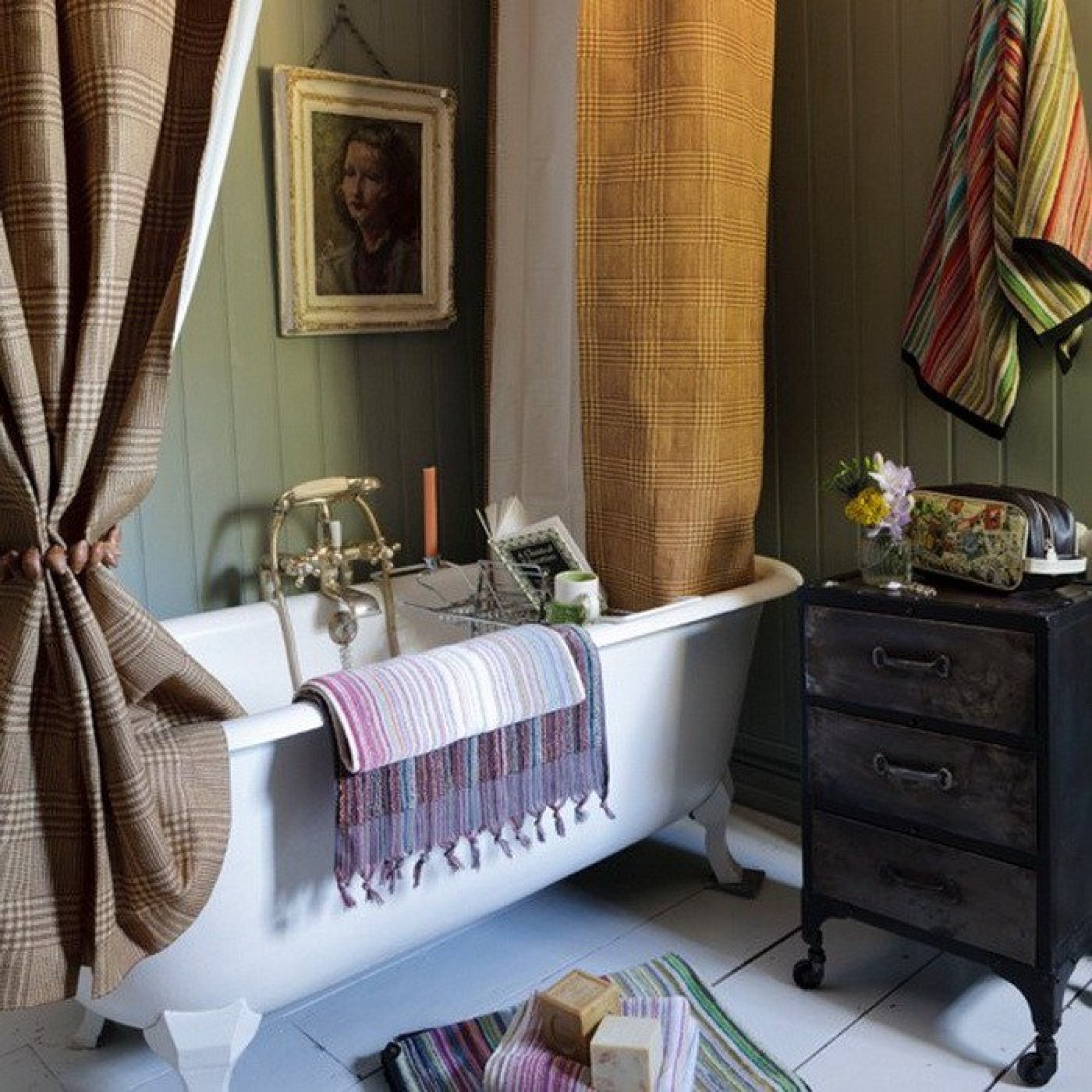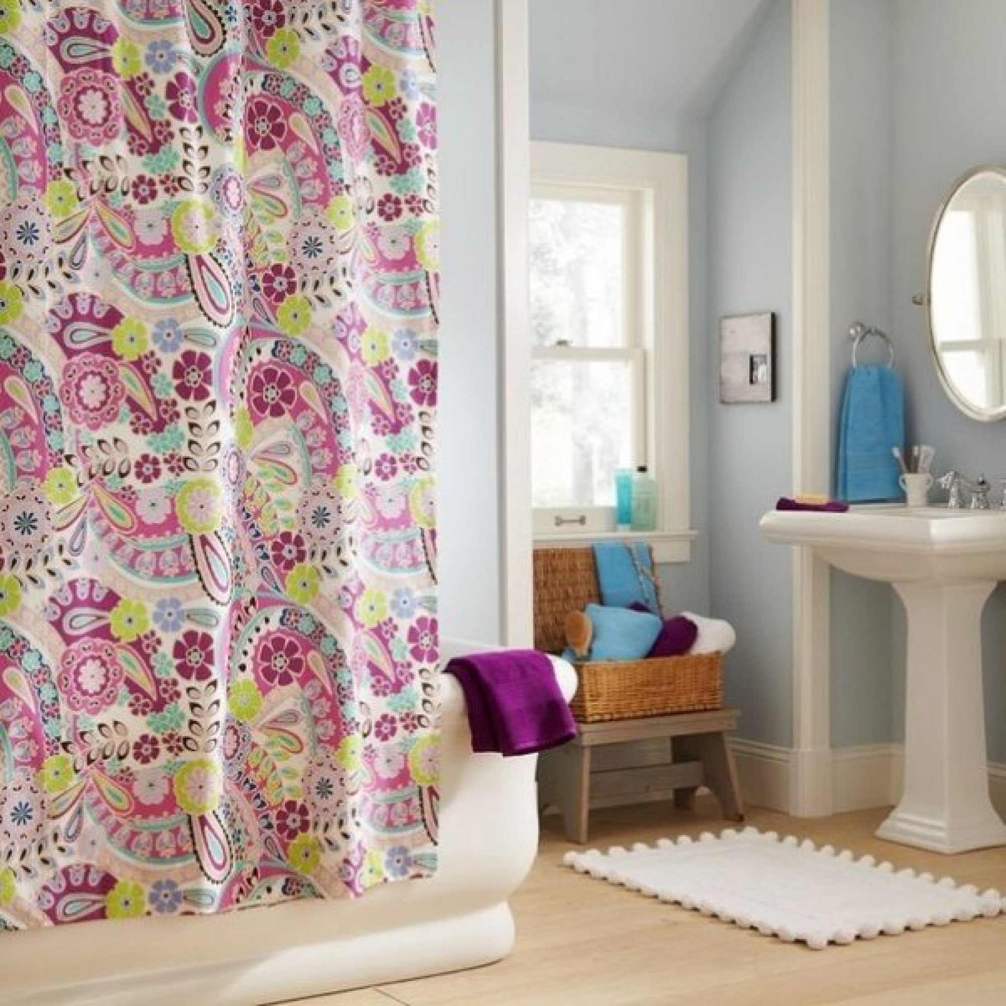 إلقاء نظرة على الستائر في الحمام (الصورة أدناه) ، حيث تعكس الألوان المدهشة أنماط الأزهار على البلاط.