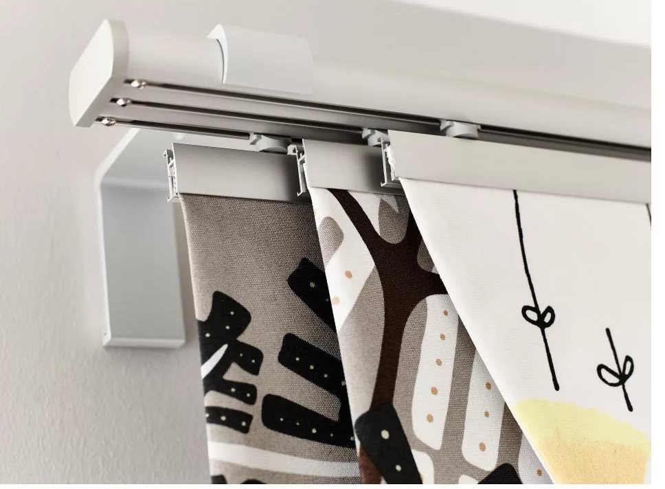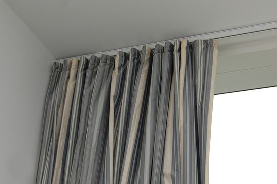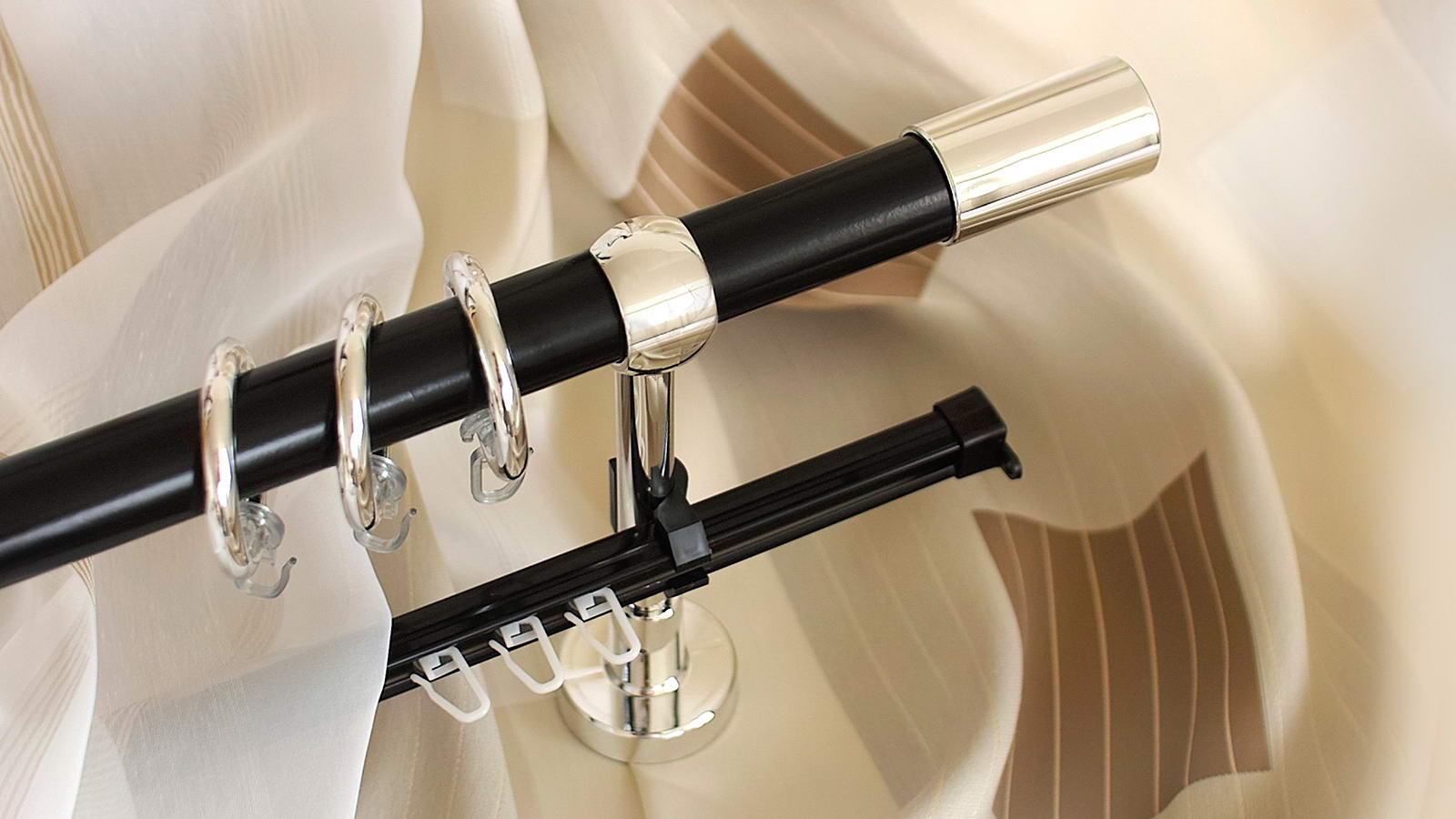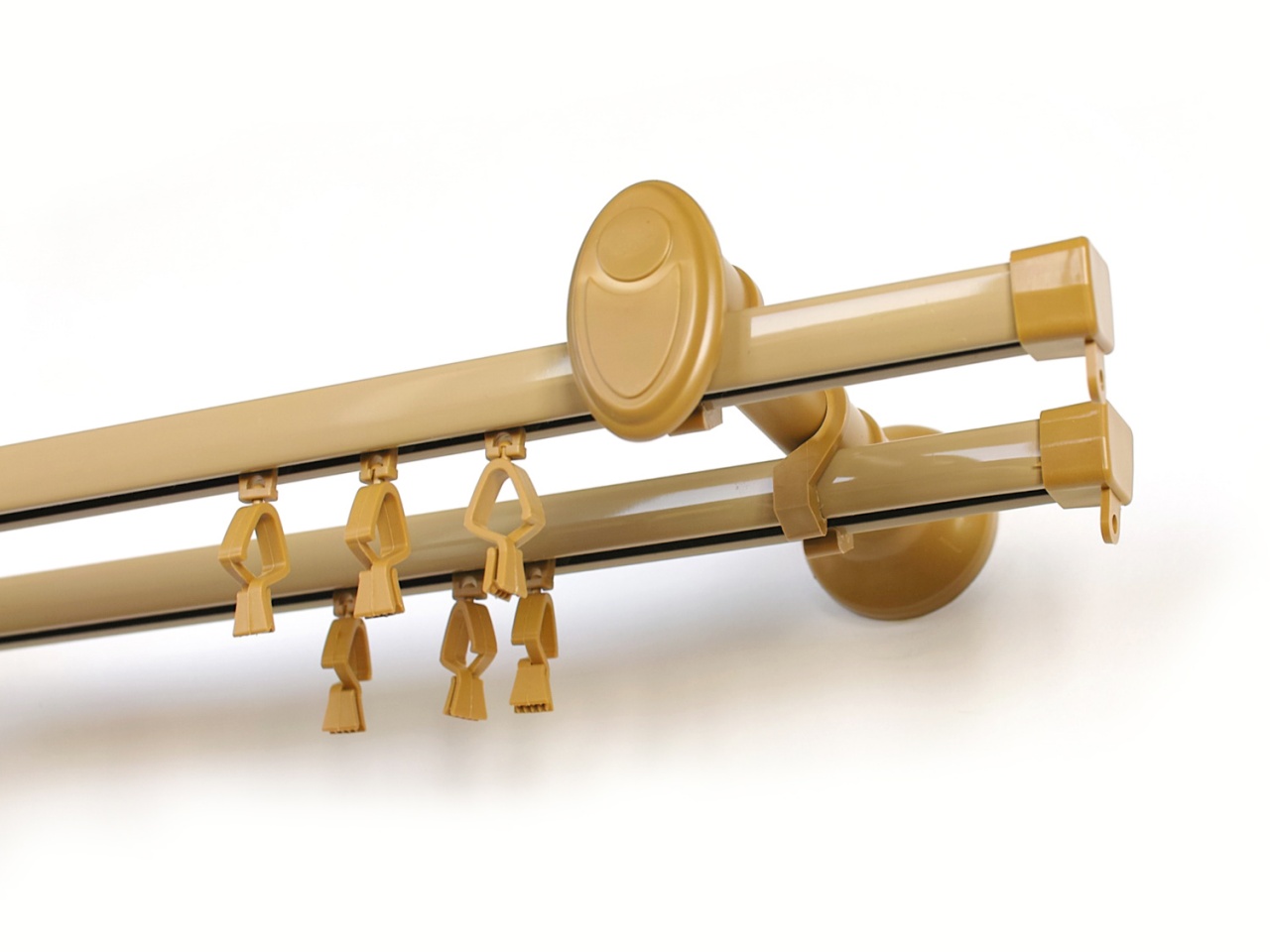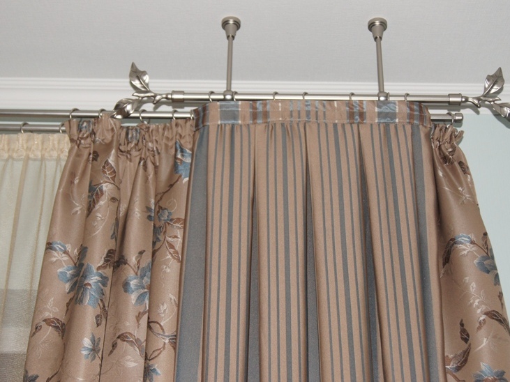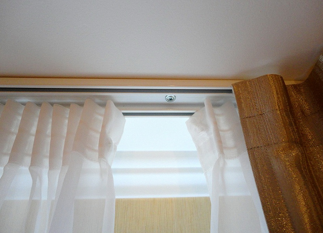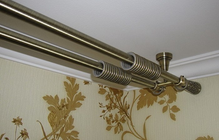 هناك طريقة أخرى مناسبة لتعليق الستائر وهي استخدام كورنيش سقف من صفين. نظام تحديد وإصلاح بسيط جدا. يمكن أن يتم التثبيت حتى من قبل سيد عديم الخبرة. لذلك ، اكتسبت الأفاريز ذات الصفين شعبية هائلة.