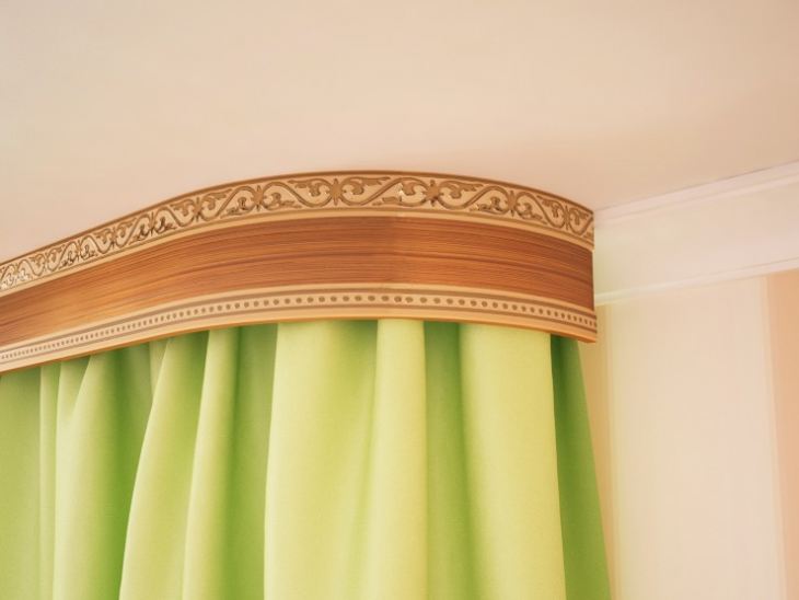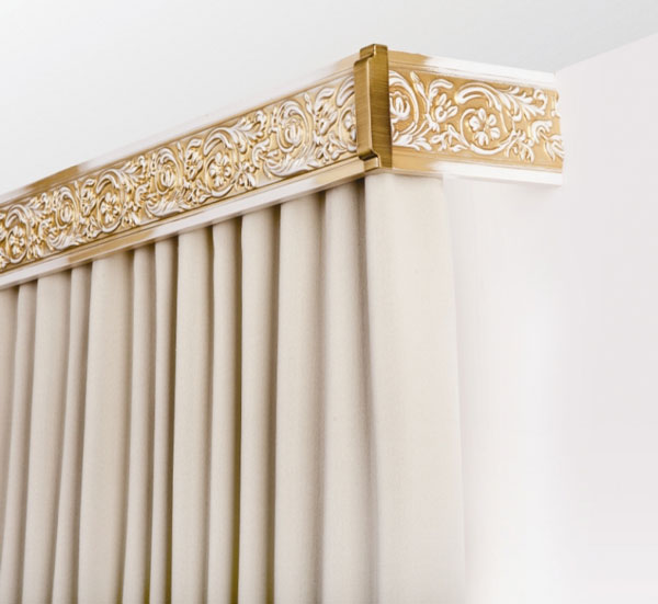 إلى جانب حقيقة أن وجود ثلاث شقوق مقطوعة تسمح لك بربط صفين من الستائر في نفس الوقت وبيلم ، يمكن أيضًا تنويع الجزء الأمامي من الكورنيش بإدخال مزخرف خاص. لتثبيته على الجزء الأمامي من الستار لديه أخدود خاص. ديكور إضافي حسب تقديرك. هناك خيارات من المقحمات المزينة بأشكال غنية من المعادن باهظة الثمن إلى الألواح العادية التي تشبه الخشب.