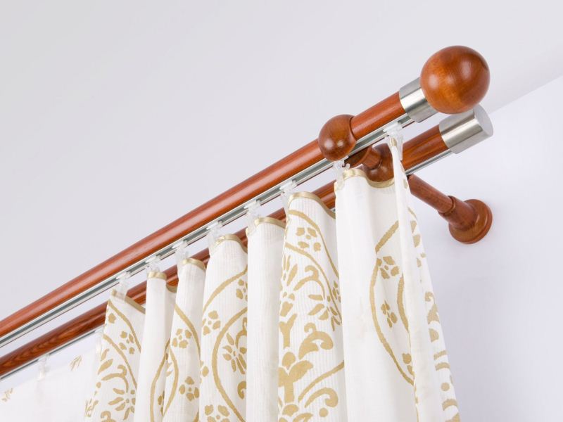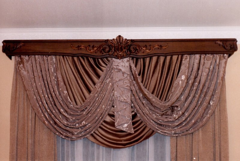 المعادن والخشب الستائر باهظة الثمن. يتم شراؤها للديكورات الداخلية الفاخرة مزينة عناصر من الخشب أو الكروم. يمكن لهذه المنتجات أن تتحمل الأحمال الثقيلة ، لذلك تأتي الستائر هنا من الأقمشة السميكة ، والمزخرفة بأناقة بالخرز الزجاجي ، والأطواق المزخرفة وجميع أنواع الكسارات.