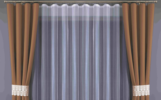 ستائر لاكونية مع ستائر خفيفة ، مزودة بتقليم مزخرف.
