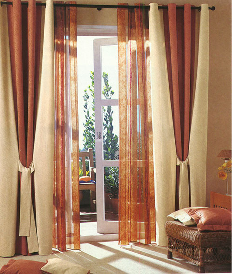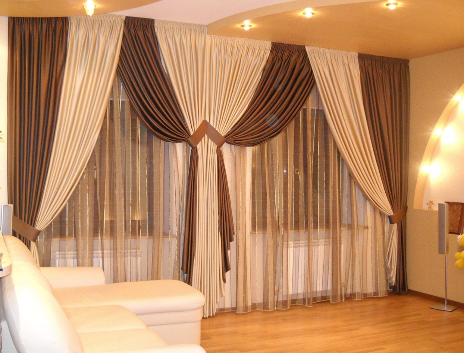 أصبحت مجموعات من النغمات والأقمشة المختلفة في منتج واحد مشهورة. لذلك ، ليس من الضروري التخلص من تشذيب المادة ، فسوف تتحول إلى ستائر أو ستائر فريدة من نوعها ستمنح الإعداد ميزات خاصة.