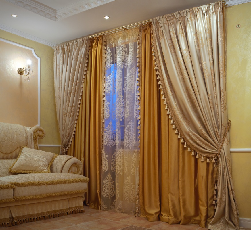 هذا النوع من الستائر عالمي ، مما يسمح باستخدامها في غرف المعيشة ، مصنوعة بأي نمط تصميم.