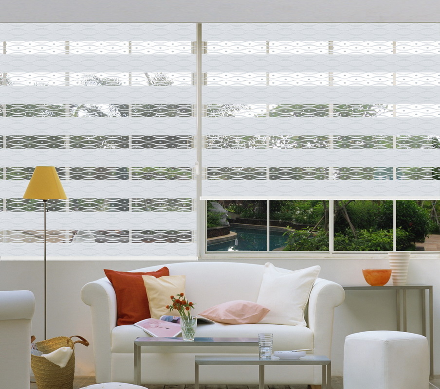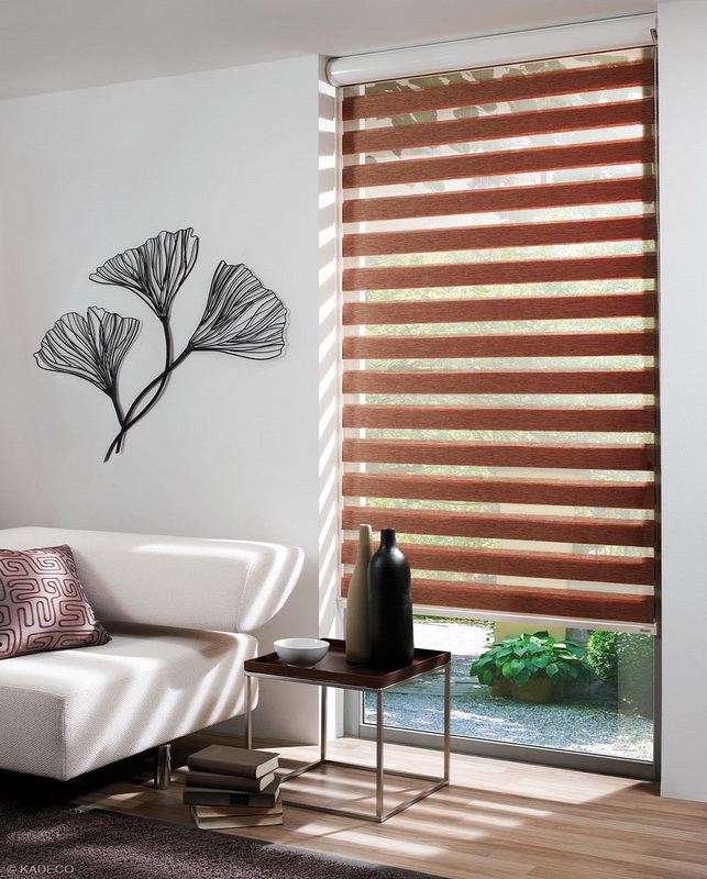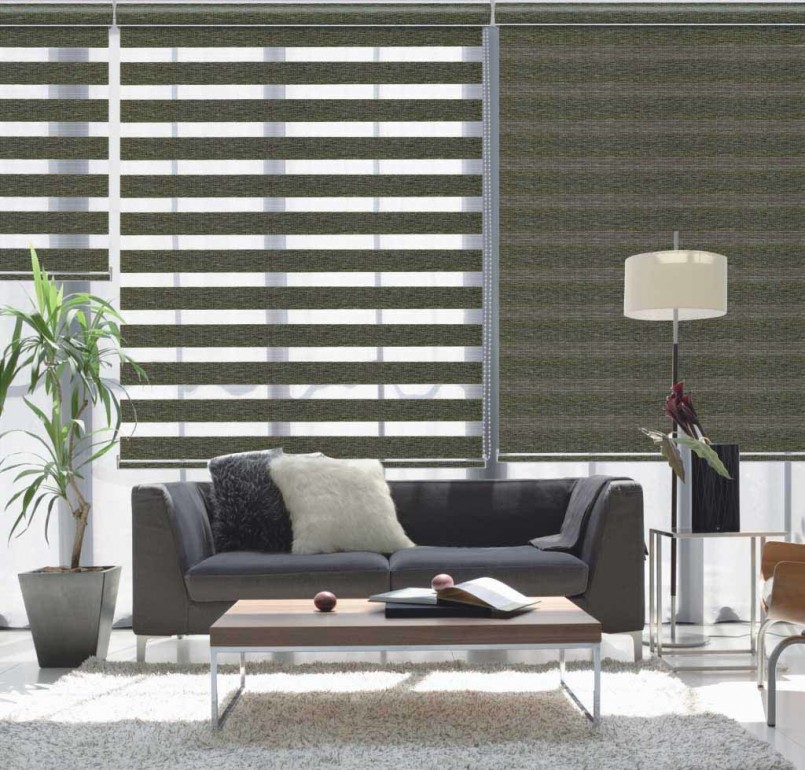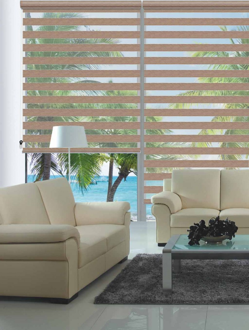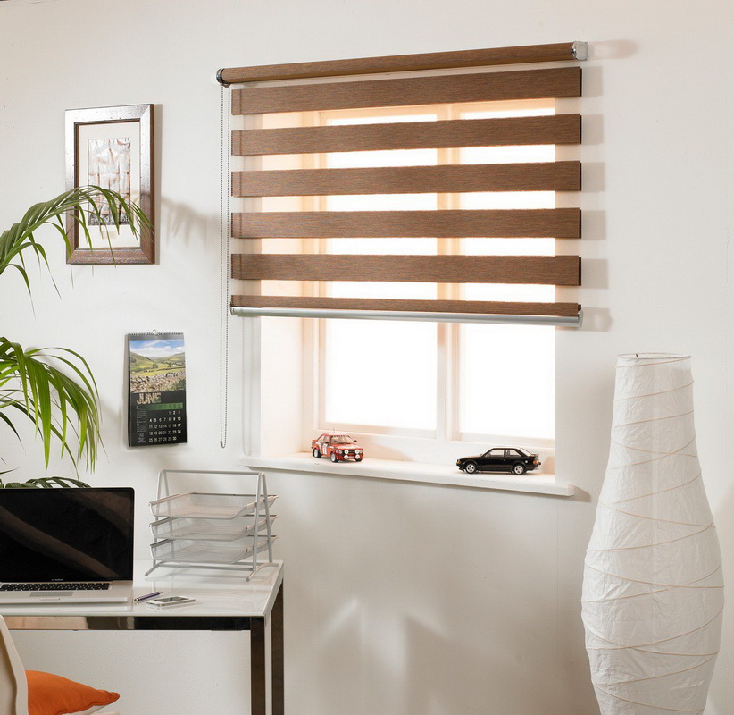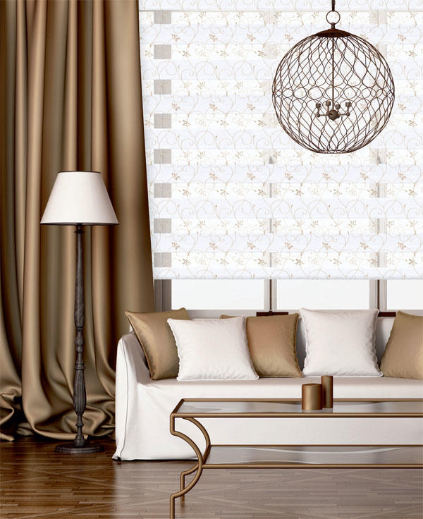 - ستائر مزدوجة. حل أنيق لمنزل خاص ، شقة. للستائر الدوارة مزدوجة تتميز مقاومة التآكل عالية ، خصائص الحماية من أشعة الشمس ممتازة ، وتصميم جذاب. فهي تجمع في حد ذاتها جميع مزايا الستائر ، والستائر البسيطة بشكل لفات. تصميم هذه المنتجات يتكون من قماشين. يتم وضعها بالتوازي مع بعضها البعض ، وتنقسم إلى خطوط مظلمة الضوء. في المساء يجب أن تتزامن المشارب الداكنة ، في فترة ما بعد الظهر - شفافة.