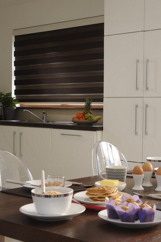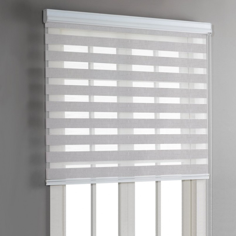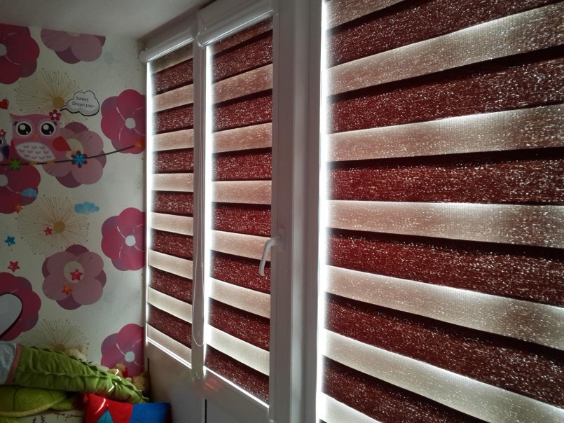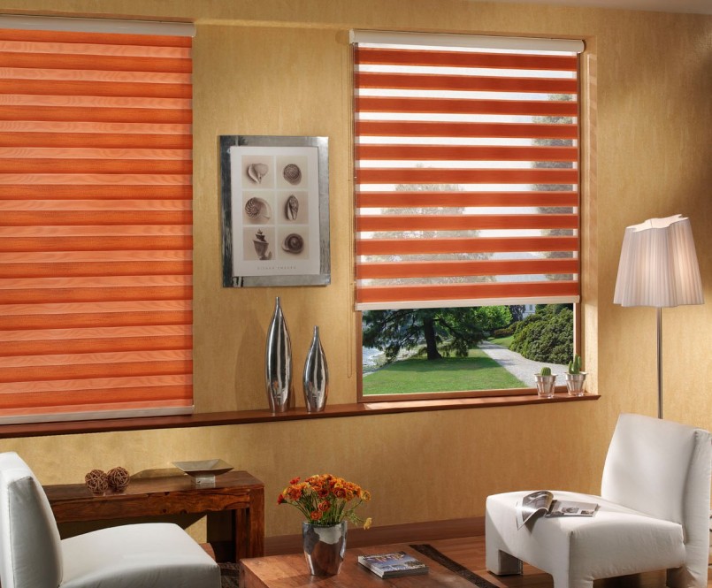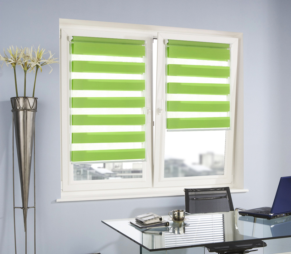 - ستائر مزدوجة. حل أنيق لمنزل خاص ، شقة. للستائر الدوارة مزدوجة تتميز مقاومة التآكل عالية ، خصائص الحماية من أشعة الشمس ممتازة ، وتصميم جذاب. فهي تجمع في حد ذاتها جميع مزايا الستائر ، والستائر البسيطة بشكل لفات. تصميم هذه المنتجات يتكون من قماشين. يتم وضعها بالتوازي مع بعضها البعض ، وتنقسم إلى خطوط مظلمة الضوء. في المساء يجب أن تتزامن المشارب الداكنة ، في فترة ما بعد الظهر - شفافة.
