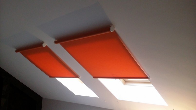 للنوافذ على سقف الغرفة هي الستائر مع جهاز التحكم عن بعد.