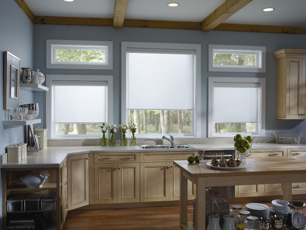 المطبخ عبارة عن غرفة يكون فيها تبادل الهواء ضروريًا. الستائر الدوارة أحادية اللون لا تمنع فتح الوشاح لتوفير التهوية.