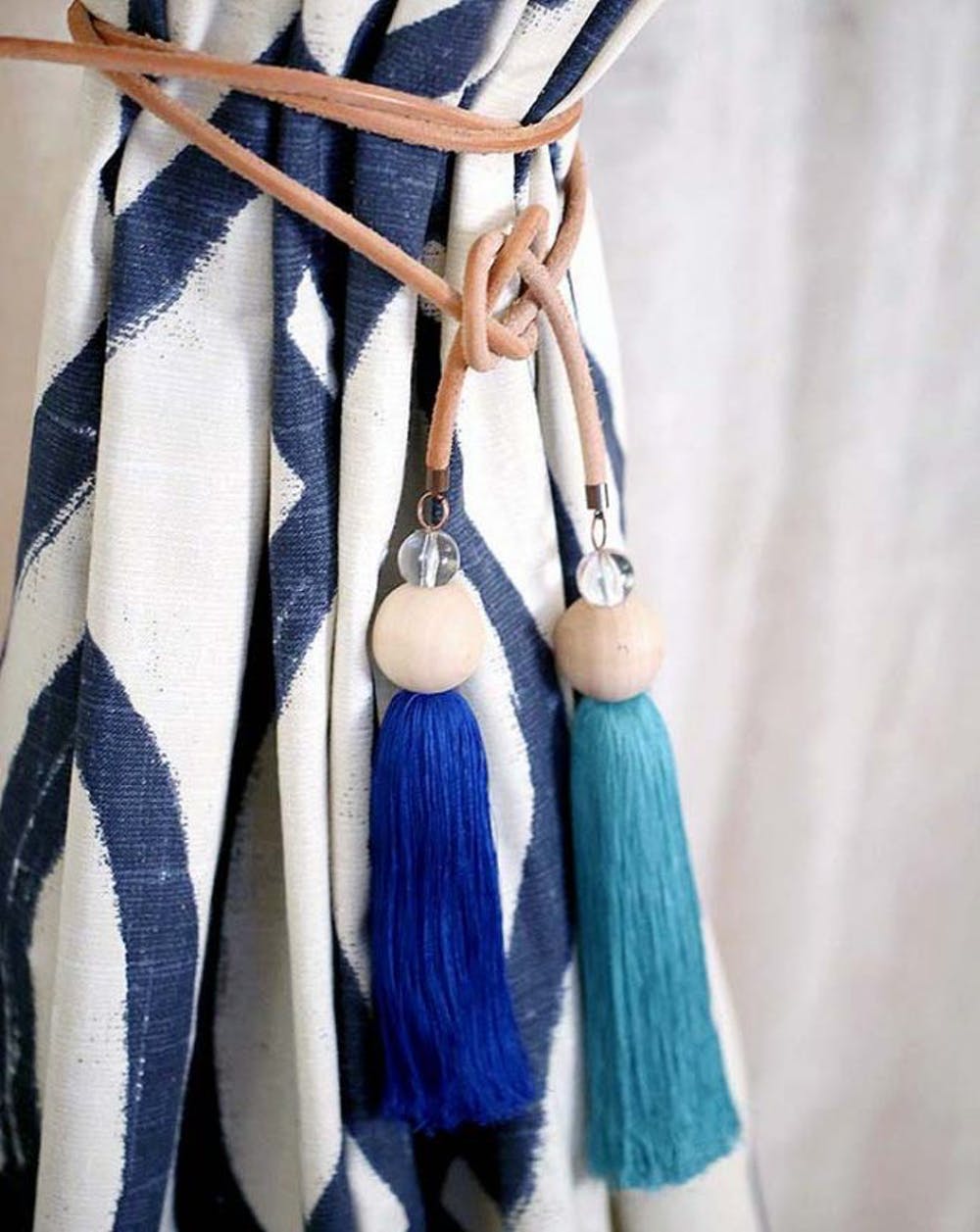 - هناك فرصة لاستخدام 2 أشرطة في وقت واحد. وهي مزينة مسبقًا بشرابات وثبّتت على خطاف ، وربط الستار على كلا الجانبين.