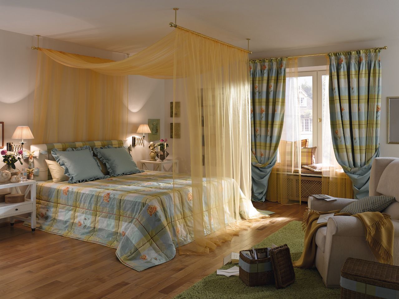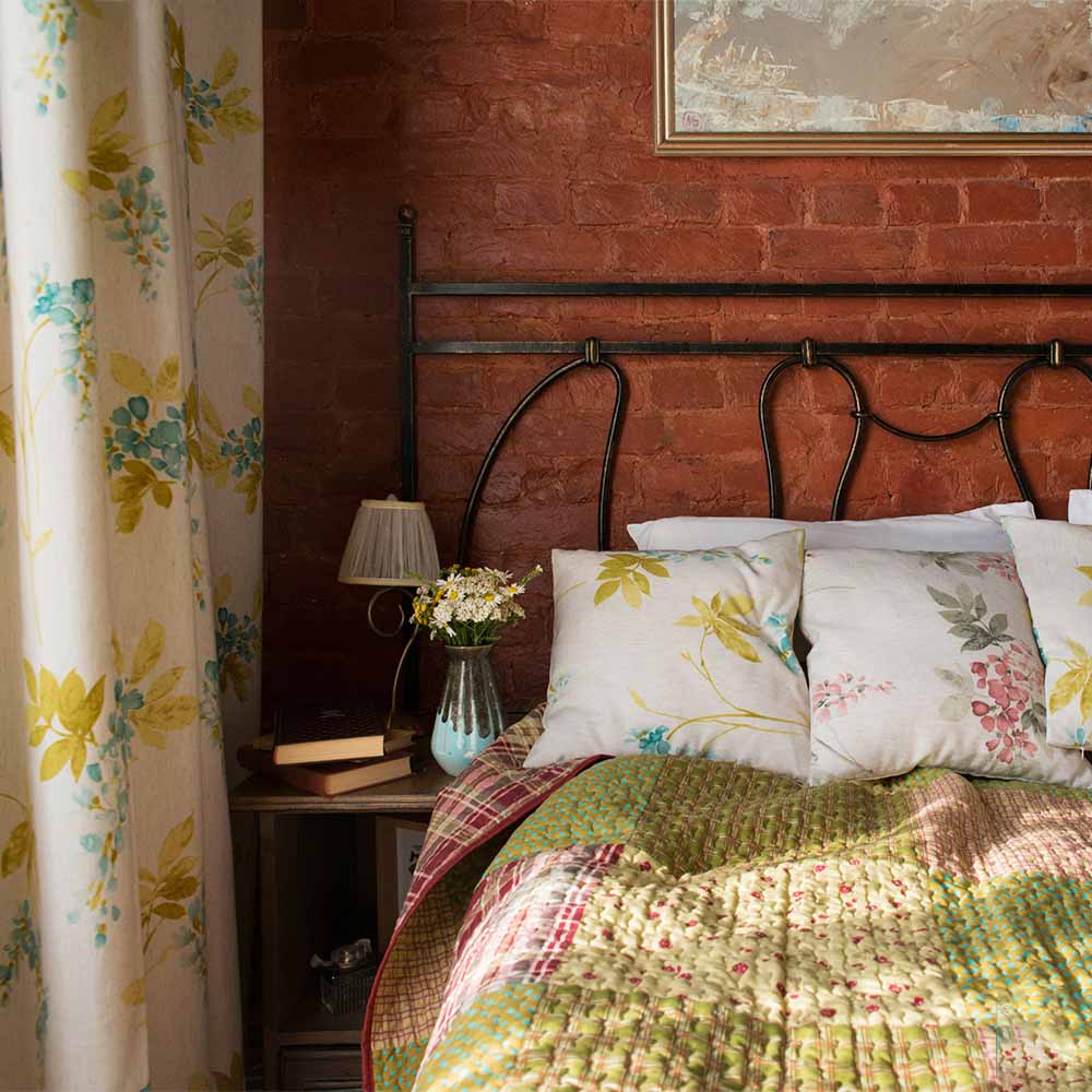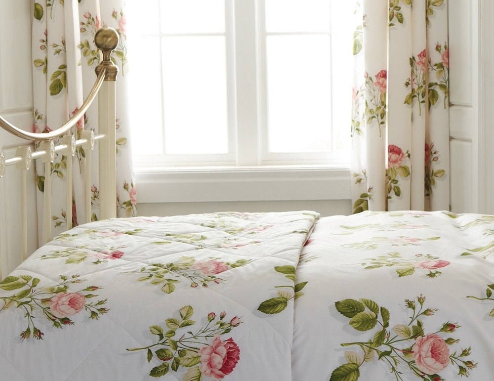 انتبه إلى حقيقة أن الستائر والمفارش مصنوعة من القماش نفسه.