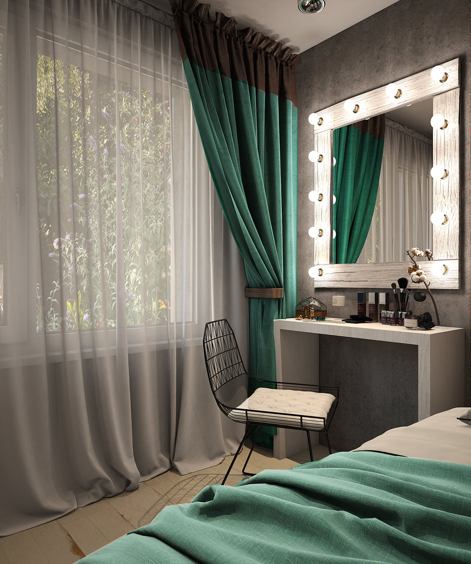 يمزج غطاء السرير والستائر بشكل متناغم مع بعضهم البعض ، مما يكمل الوضع العام في الغرفة بشكل إيجابي.