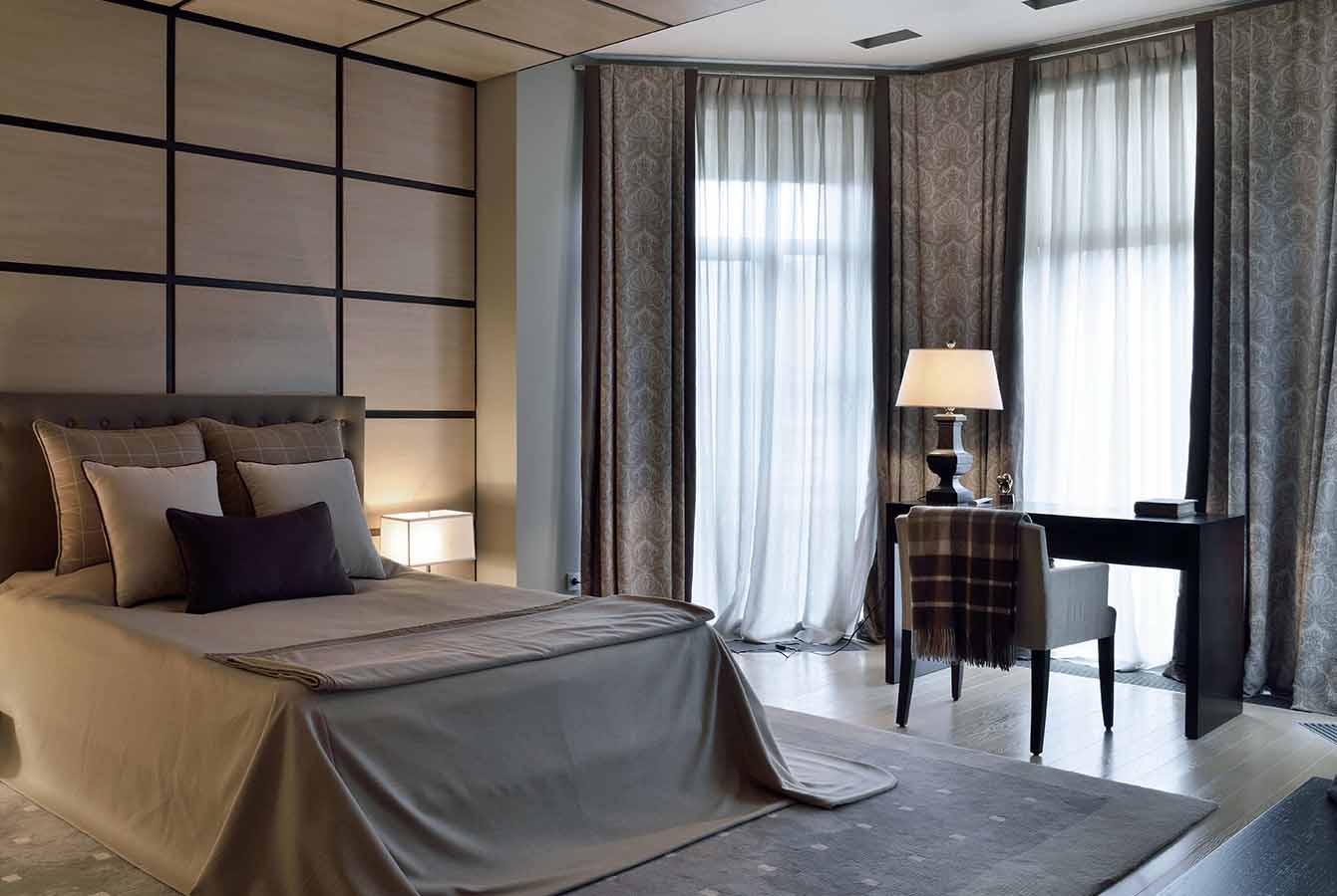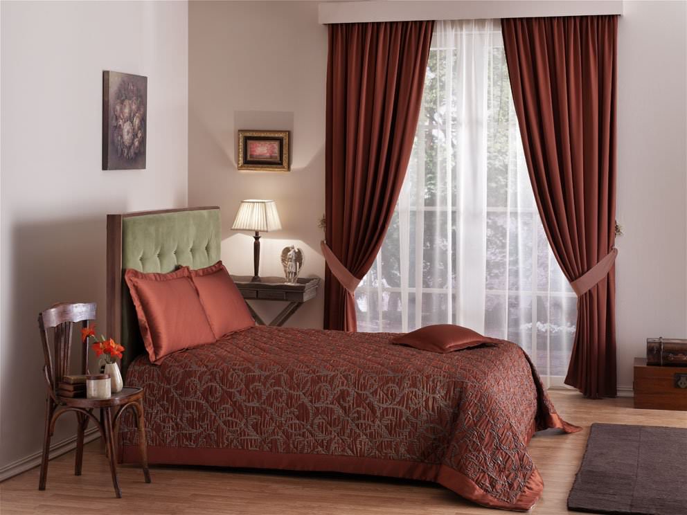 - يجب اختيار الستائر في غرفة النوم مع غطاء سرير على السرير بنفس نمط الغرفة ؛ فهو انسجام يعزز الاسترخاء الجيد.