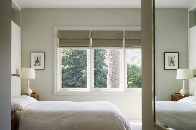 ستائر قصيرة على عتبة النافذة في غرفة نوم واسعة