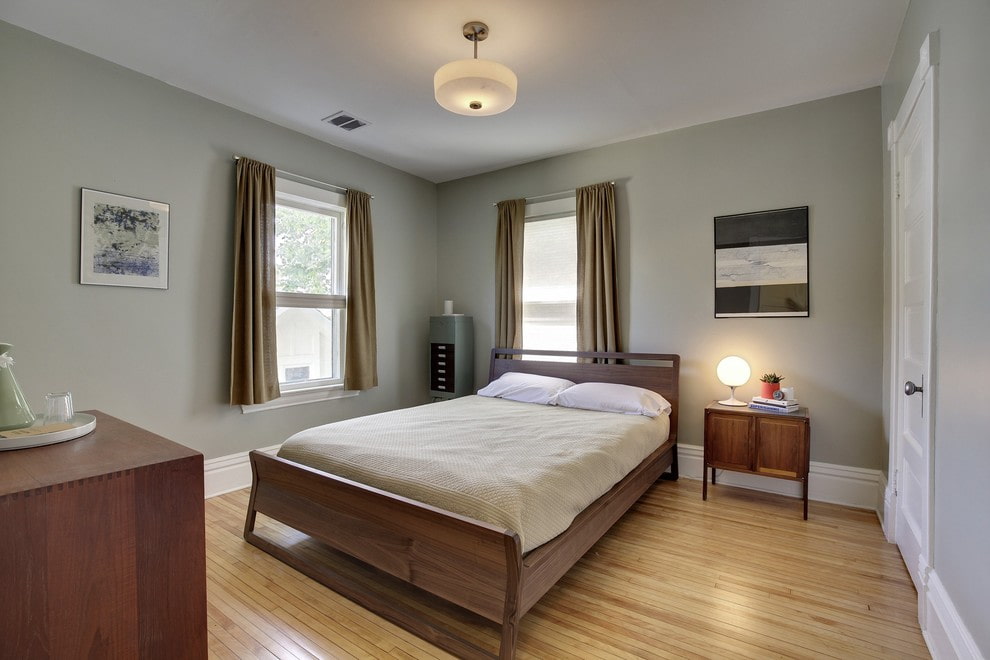 - 5 مزيج من الستائر القصيرة في غرفة النوم مع الأثاث وورق الجدران