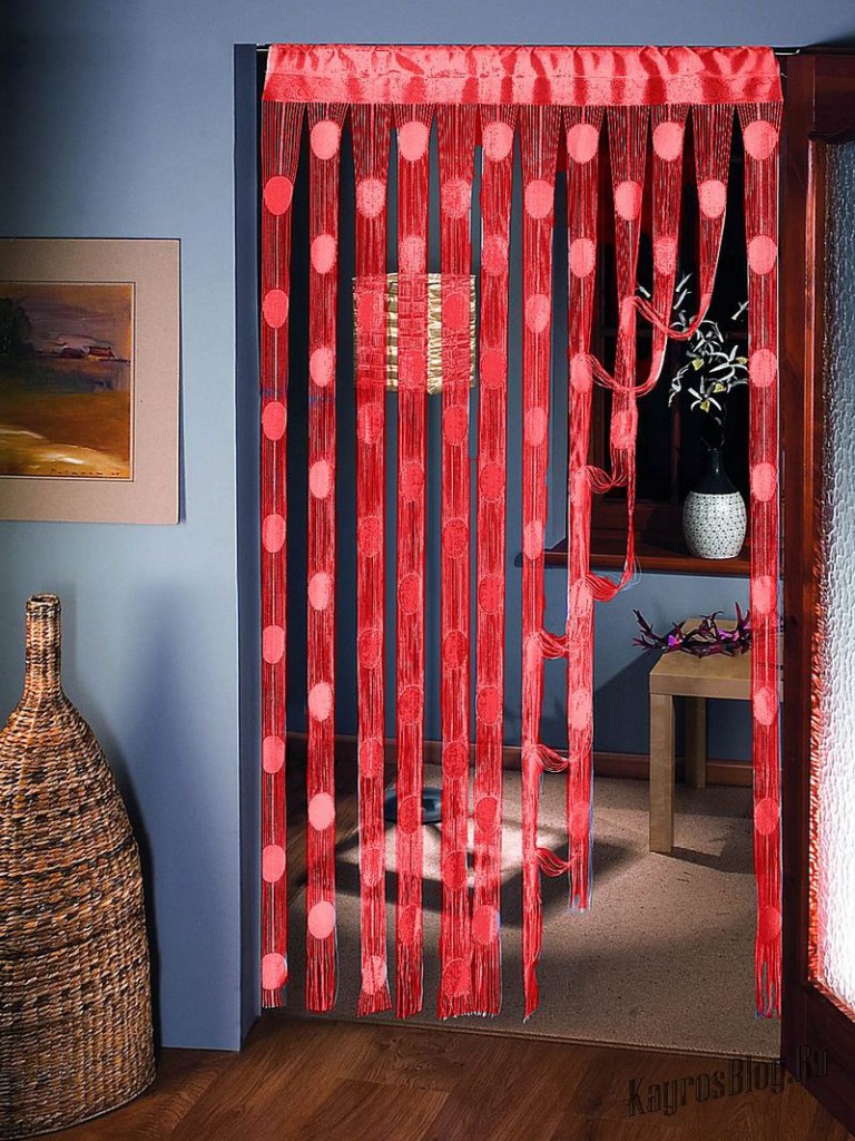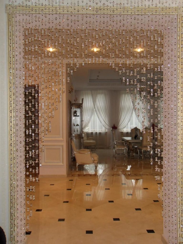 ستائر الغزل والخرز - واحدة من أفضل الخيارات ، وبالتالي يمكن بسهولة اختيار حجم كل خيط ، وبالتالي اختيار الخيار المثالي للباب الخاص بك. هذا النوع من الستائر يبدو جميلًا وسيكون مناسبًا ، سواء للاستخدام أو لاختيار الحجم الأمثل.