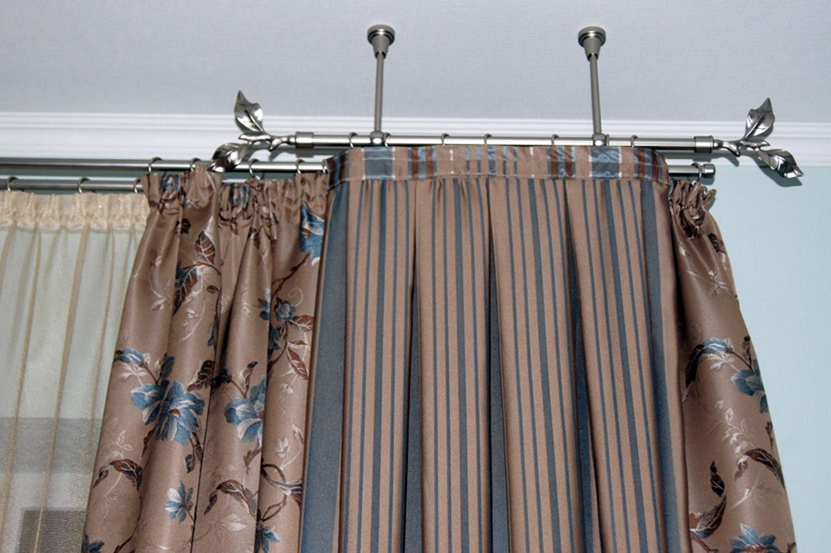 صف مزدوج القضبان الستار عن السقف تبدو عضويا وذات صلة في النمط الشرقي ، الباروك ، وكذلك أسلوب الإمبراطورية. قماش راق من السقف يخلق جو عطلة خاص وحكايات خرافية. وغالبا ما تستخدم هذه التقنية في أماكن العمل لمختلف المناسبات الاحتفالية.