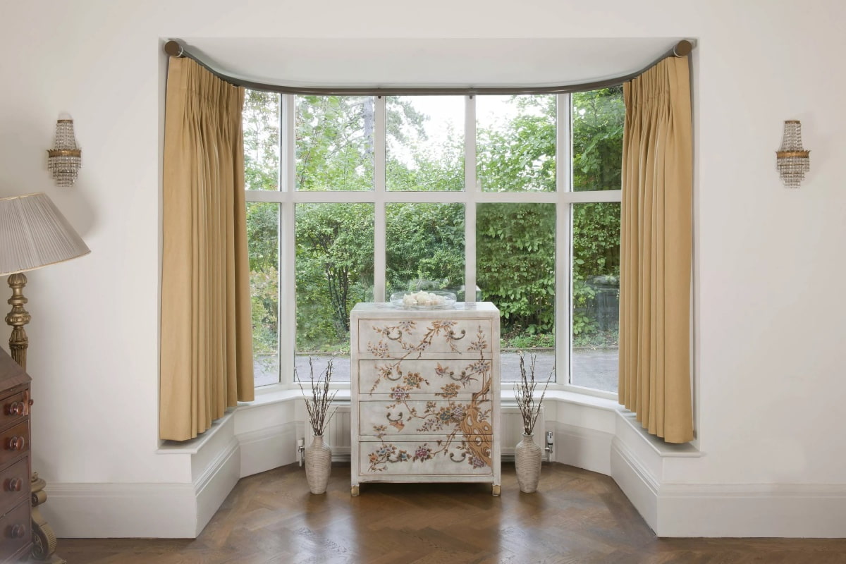 في الداخل بنوافذ نصف دائرية بانورامية ، تعد طنف السقف هي الطريقة الوحيدة تقريباً التي تزين النافذة بشكل متناغم وتخلق تأثير العمق.