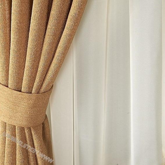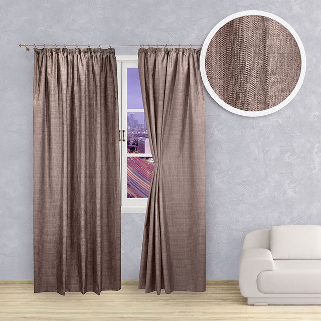 ستائر مستقيمة مع ثنى خفيف في التعلق بالطنف - وهو حل للمواد الخشنة. في هذه الحالة ، زينت الستائر مع هامش من نفس اللون. أيضا الديكور هو حجم فرشاة في الخلفية.