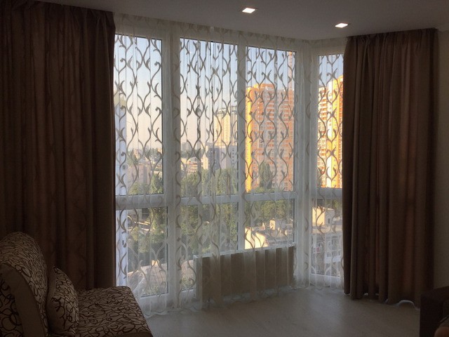 نموذج لأولئك الذين بدأوا للتو لجعل الداخلية الخاصة بهم. الستار مخيط من نوعين من القماش: الأبيض والأزرق. بدون الأقمشة ، في حجمها يتبع ببساطة محيط النافذة.