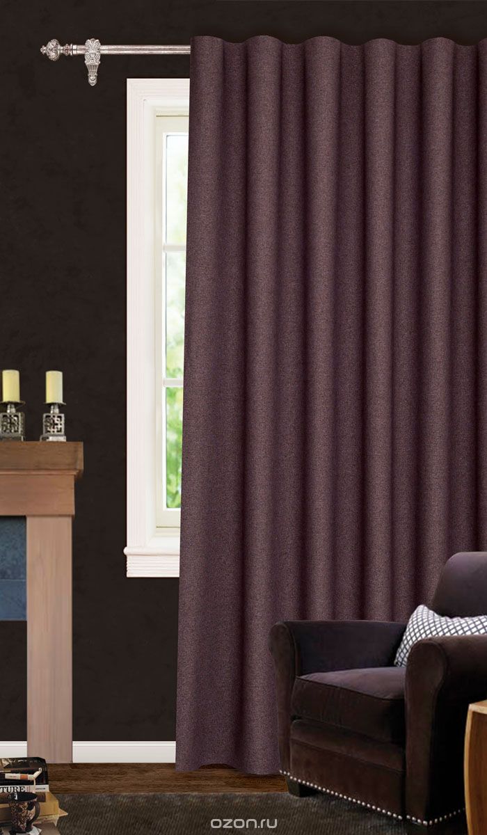 Portieres من لون الشوكولاته الغنية بتصميم بسيط ، تعلق على الطنف على جروميت. في هذه الحالة ، ستكون النافذة عبارة عن لهجة مشرقة في داخل غرفة المعيشة. الشدة والبساطة.