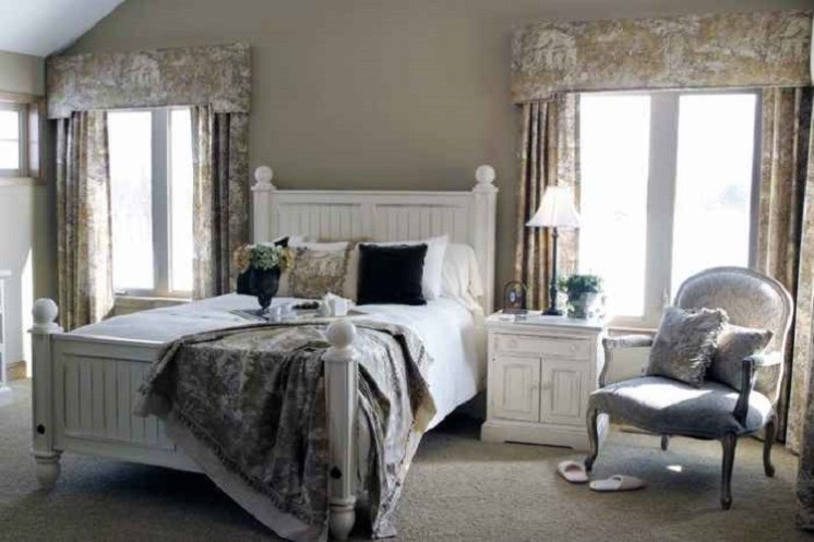 خيار شائع جدًا لغرفة النوم: نموذج بسيط للستائر بلون الباستيل. الأثاث وزخارف الجدران وحتى العناصر الزخرفية هي أيضا بألوان الباستيل. جو من السلام المطلق والراحة.