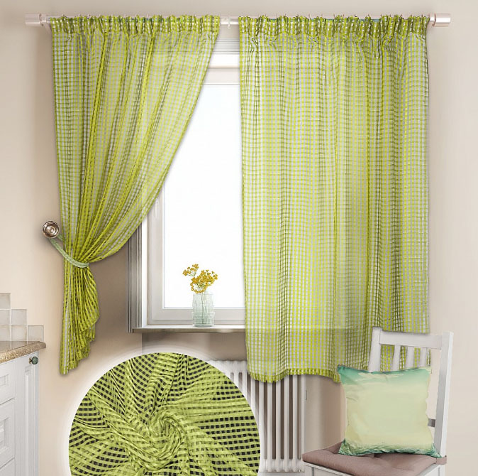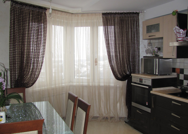 تركت الإضاءة تمامًا في الضوء ، وستكمل الستائر تمامًا التصميم الداخلي لغرفة المعيشة والمطبخ. تبدو أنيقة جدا وغير عادية. فهي مكتفية ذاتيا بالكامل ولا تحتاج إلى أي إضافة. ولكن إذا كنت ترغب في ذلك ، فيمكن أن تستكمل مع التقاطات رشيقة ، والخرز أو الزهور الضخمة.