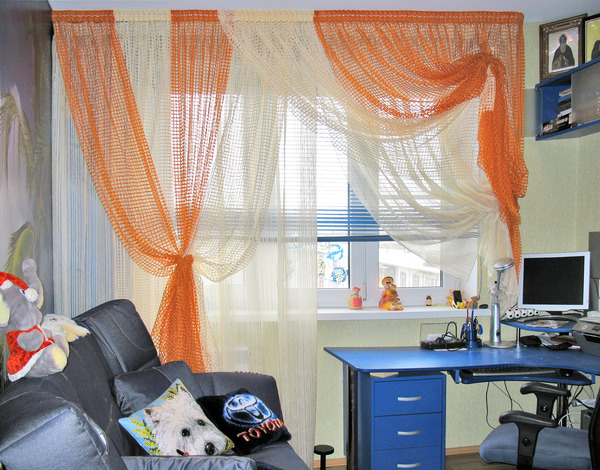 نظرًا لأن الستارة تبدو ضخمة جدًا ، من الأفضل استخدامها في غرفة كبيرة ، بحيث لا "تسرق" المساحة ، ولكن توازنها. تجدر الإشارة إلى أنه في كثير من الأحيان تزين الشبكة الكبيرة نافذة مفتوحة بشكل مستقل ، دون استخدام portieres.