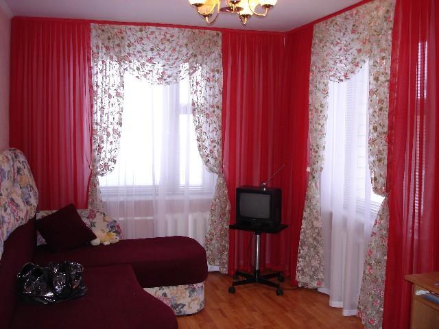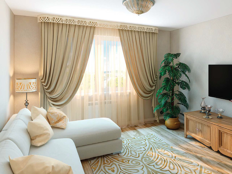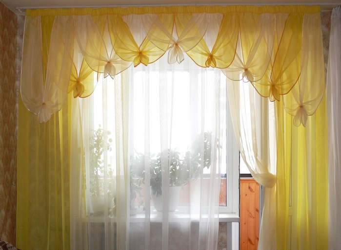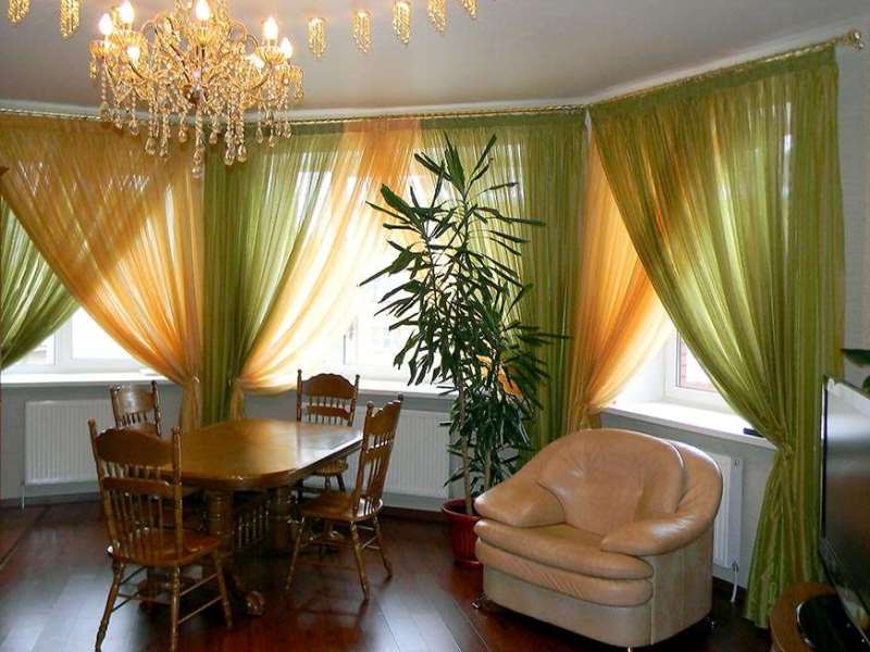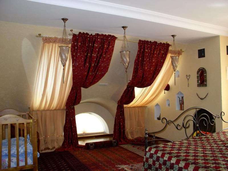 مفاجأة الضيوف بتصميم داخلي غير عادي: طبقتين من الستائر والستائر. في نفس الوقت ، تقع الطبقة العليا للحجاب أعلى الستائر على أفاريز إضافية خاصة.