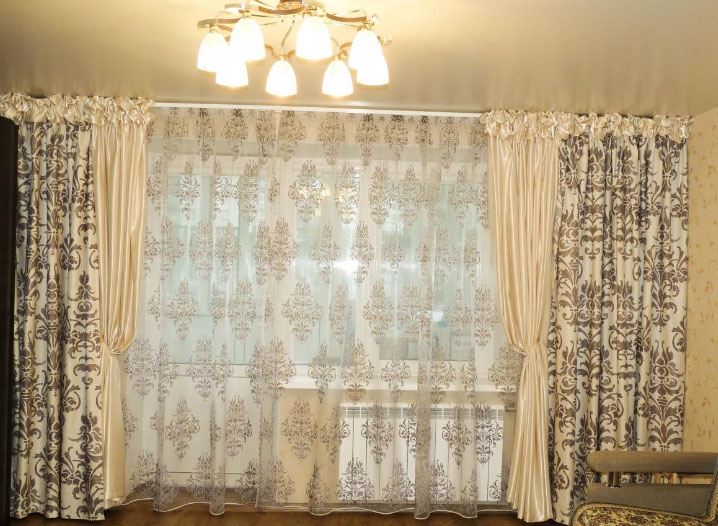 الستائر الباستيل الجاكار مع الحجاب الأبيض والتصميم متعدد الطبقات من الستائر تكمل بشكل مناسب الداخلية في النمط الكلاسيكي.