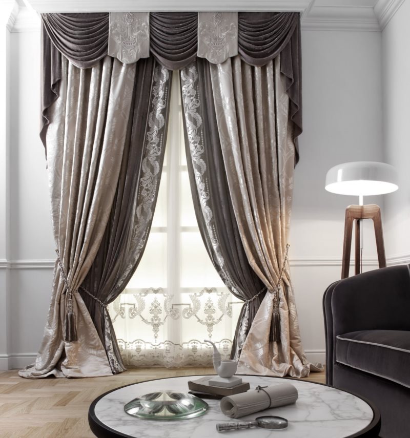 في معظم الأحيان ، عند تصميم النوافذ في غرف كبيرة وواسعة ، يفضل المصممون التصميمات المعقدة ونوع الجمع من لامبريكين. فهو يجمع بانسجام بين العناصر الكثيفة والناعمة. سيكون مثل هذا الجمع بمثابة لهجة مشرقة مستقلة في الداخل.
