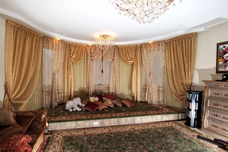 - للتأكيد على الجدية سيساعد الستائر "غطاء الأسقف" الظاهر في الصورة. هذا الخيار مناسب فقط للغرف الواسعة.