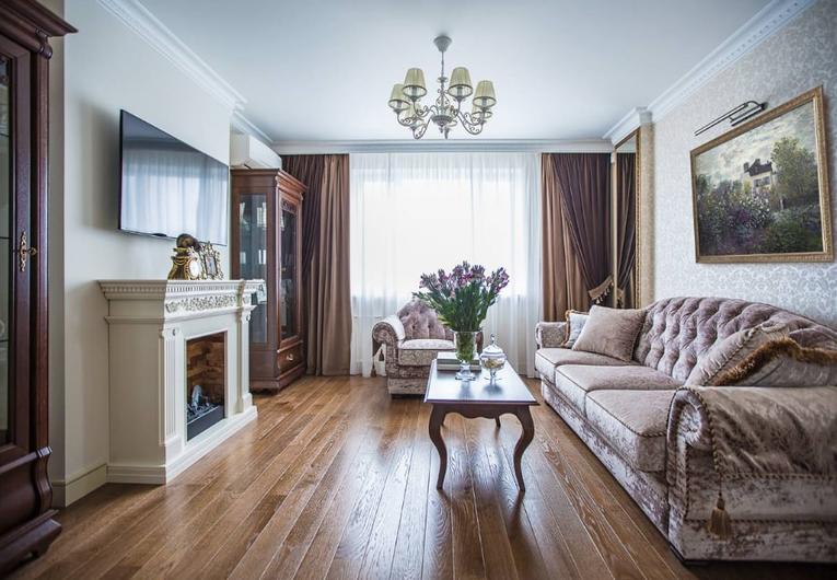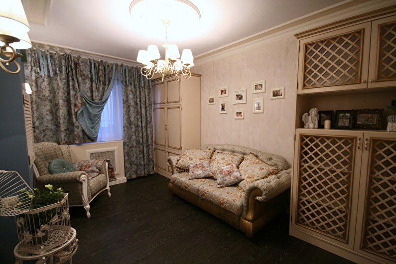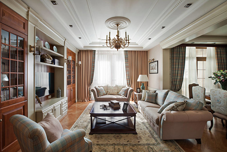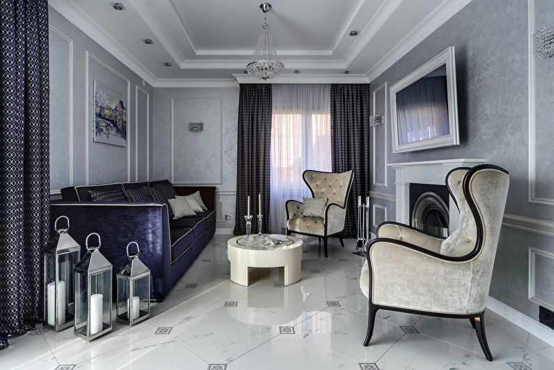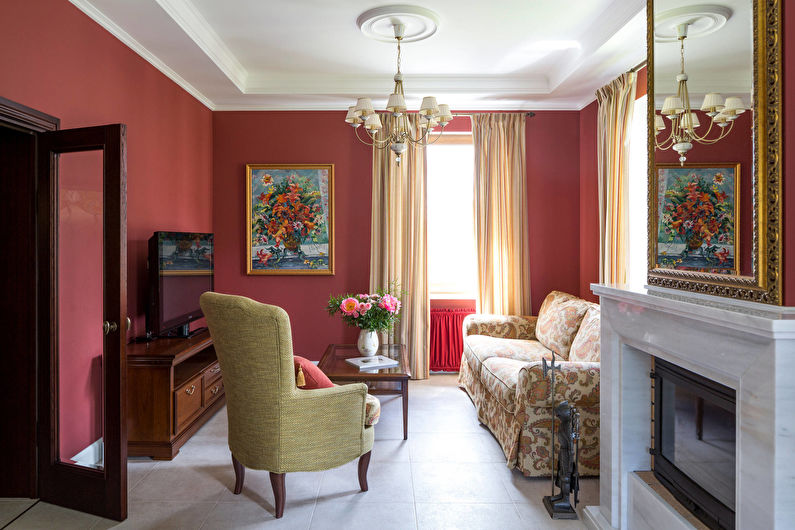 لذلك ، من الناحية التاريخية ، يوحي النمط الكلاسيكي بالديكور الفخم والغني. ومع ذلك ، يتم إنشاء جو الثروة اليوم ليس بسبب التألق المفرط ، ولكن من خلال استخدام الأقمشة النبيلة الطبيعية. يمكن أن يكون نسيج الجاكار ، الديباج أو المخمل. يجب أن تكون نفس الأقمشة موجودة في تنجيد الأثاث. بخلاف ذلك ، من الأفضل إعطاء ألوان وأنسجة أكثر هدوءًا مناسبة للتصميم الداخلي العام. وكان الشيء الرئيسي أن النسيج الستار كثيفة.