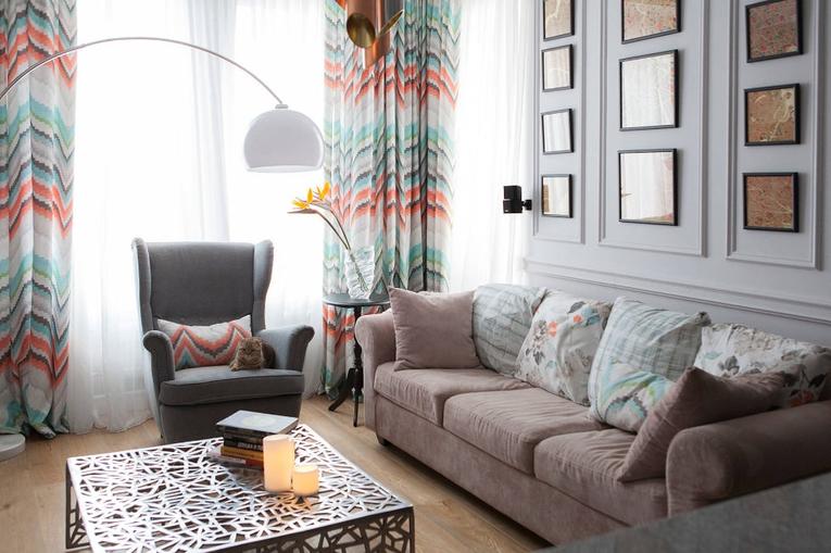 إذا كان تصميم غرفة المعيشة مزخرفًا بألوان أحادية اللون ، فستكون الستائر المزودة بطباعة الصور أو الرسم مكملاً مثالياً للديكور الداخلي.