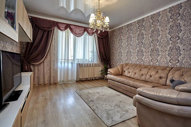 تظهر الصورة ستائر القاعة في شقة عادية. كما ترون ، حتى غرفة المعيشة النموذجية تبدو أنيقة وأنيقة. التجارب مع اللون والملمس تعطي نتيجة مذهلة.