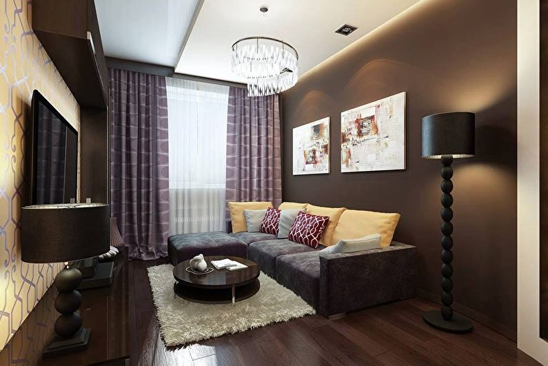 على الرغم من أن الستائر تسمى "الليل" ، فإن لونها ليس بالضرورة أن يكون غامقًا. هذا هو الحال بالضبط عندما يلعب نسيج نسيج الستار دورًا أكثر أهمية من لونه. كقاعدة عامة ، يتم اختيار الستائر بلونين أغمق أو أفتح من الجدران. الشيء الرئيسي هو أنها يمكن أن تؤدي وظيفتها الرئيسية - لحماية غرفة المعيشة من الضوء المفرط.